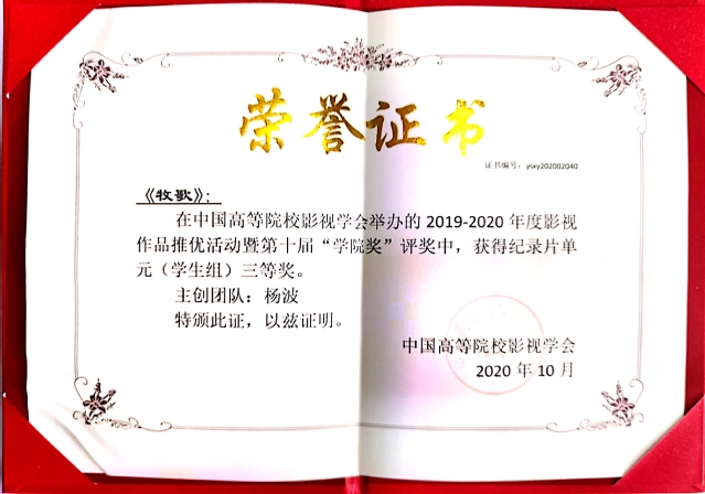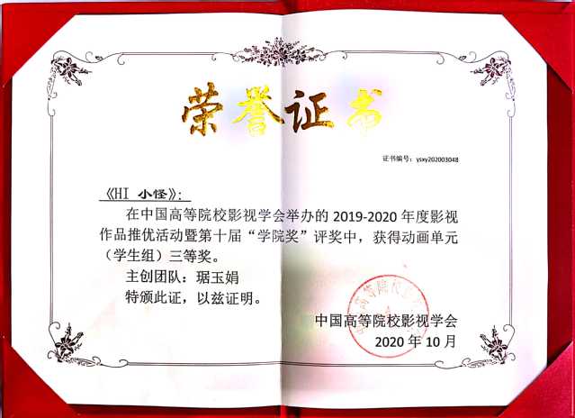 艺术设计学院动画系在本次中国高等院校影视学会举办的“学院奖”中斩获双奖,分别是纪录片单元杨波作品《牧歌》(指导老师:张搴)与动画单元琚玉娟作品《HI 小怪》(指导老师:王威),获得2019-2020年底影视作品推优暨第十届“学院奖”国家级三等奖,金秋十月,带着影视高等教育的共同追求,怀着对未来影视艺术诗与远方的无限向往,我们相逢天府之国,欢聚美丽川影,共襄盛举,在此为获奖的同学和优秀指导老师表示祝贺。