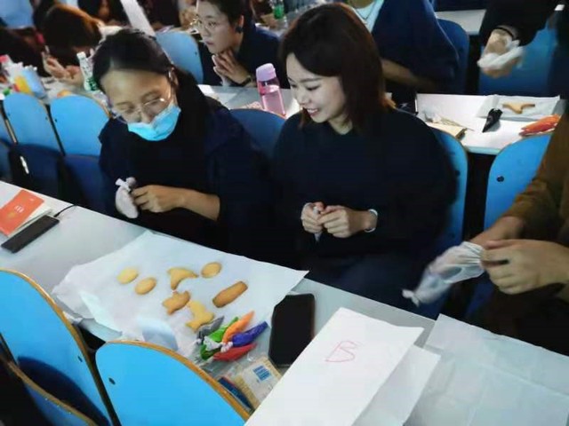 贺筱露先讲述了如何制作令人耳目一新的新式饼干、以及饼干的制作手法和技巧。随后,她和同学们一道,分成几个小组,按照烘焙流程,把半成品曲奇饼干和各种颜色的糖霜巧妙糅合,在王老师的指导下,风采各异的不同造型的创意糖霜饼干逐个完成。