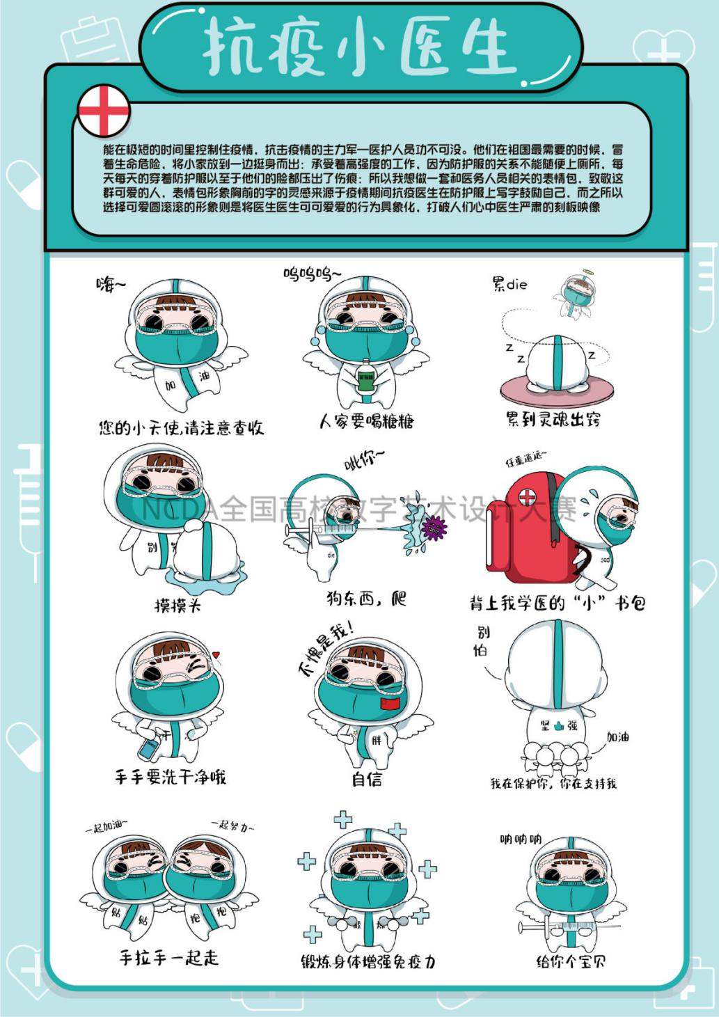 作品采用拟人趣味性的设计手法,将抗疫医生可爱的形象艺术化,数字化。利用微信表情包的传播优势来传递这份爱,致敬这群可爱又可敬的人。
