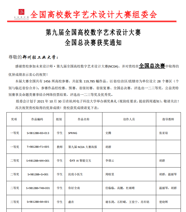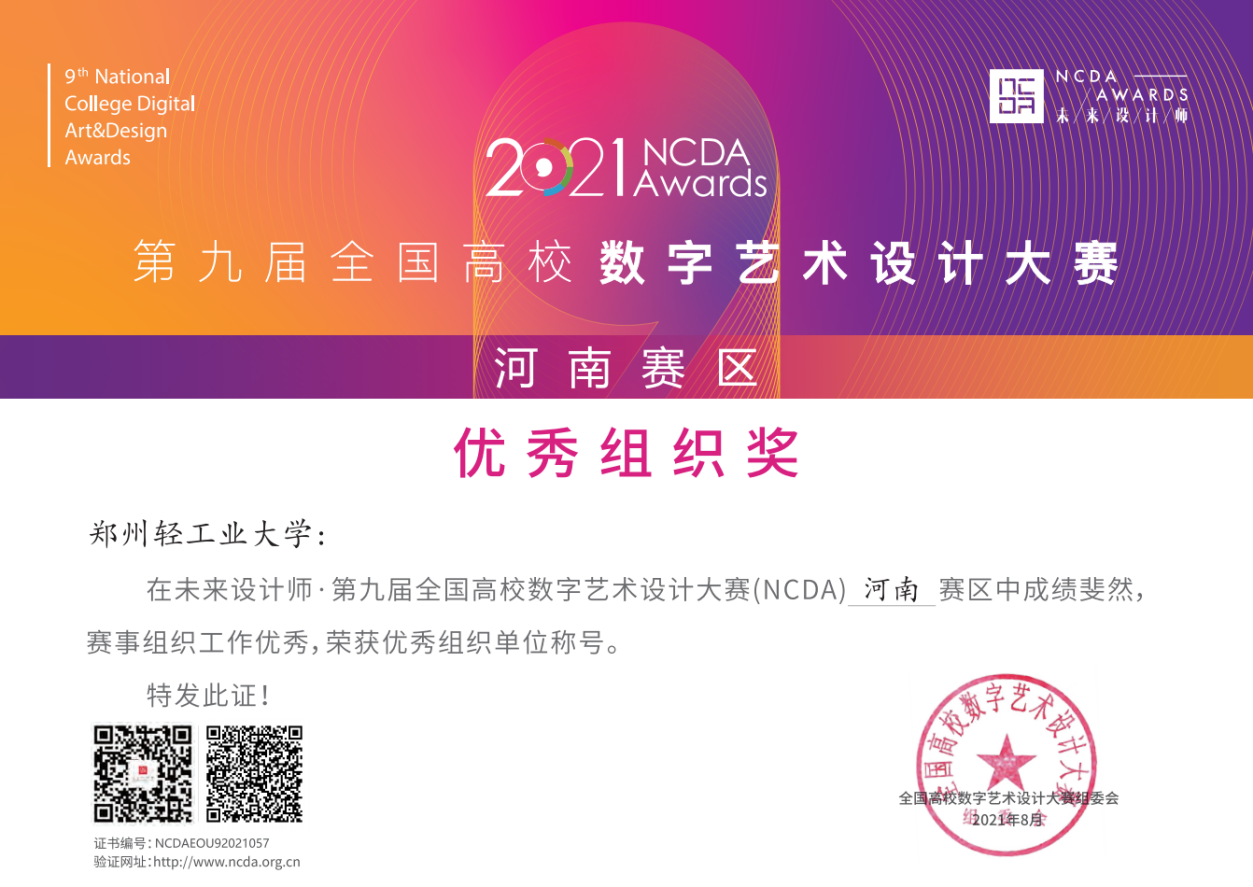 近日,艺术设计学院师生在国家工业和信息化部人才交流中心主办的2021第九届全国高校数字艺术设计大赛(NCDA)中斩获佳绩。在全国总决赛中,数字媒体艺术专业共获得奖励7项,其中一等奖2项、二等奖3项、三等奖1项、优秀奖1项;在河南省省级赛中获得奖励36项,其中一等奖11项、二等奖11项、三等级14项。