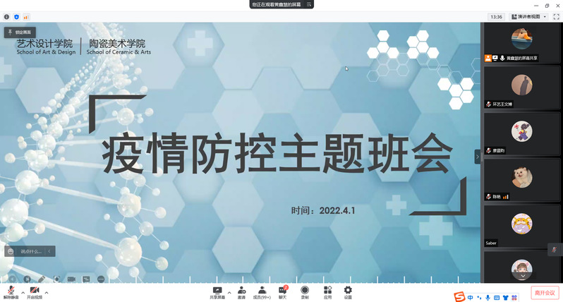 为深入贯彻学校疫情防控工作要求,提高学生防疫意识,进一步维护校园安全,4月2日下午,艺术设计学院召开研究生“疫情防控”主题线上班会,本次会议由辅导员黄鑫慧老师主持,学院全体研究生参加。