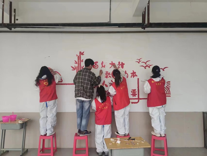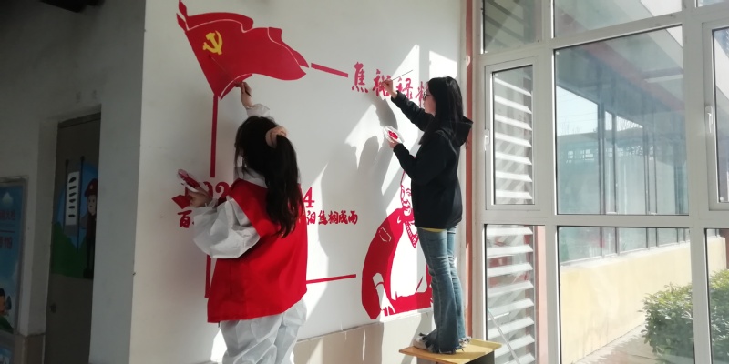 本次墙绘志愿服务活动主要围绕党的精神谱系和党风廉政建设两大主题,绘制面积近150平方米。活动中,为打造出优秀作品,同学们精心构思,反复讨论设计方案,然后勾线、上色、精修,经过两天的绘制,焦裕禄、红旗渠、愚公移山、滔滔黄河等最能代表河南精神的元素跃然于墙上,为小学的校园文化建设增加了浓重的一笔。