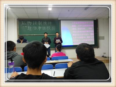 我院各年级团支部通过演讲、座谈、辩论赛、征文等多种形式让大家了解知法懂法的必要性,让每位大学生意识到法律对于一个国家的重要性,更是懂得了作为当代的大学生,要善于用法律知识维护自身的合法利益。目前在部分大学生中间还存在的法律意识淡薄,自我保护能力缺乏现象,为了能够提高主题团日活动开展效果,各团支部结合自身情况,运用典型案例、观看法制视频等方式加深了同学们对法制的认识,主题团日活动上同学们针对相关法律问题纷纷提问,还结合具体案例分析讨论,现场气氛活跃。各团支部通过PPT向同学们讲解我国法制进程,并要求每位大学生提高自身的法律意识,努力学习法律法规,要做一名知法、懂法、遵法、守法的好青年,严格规范自己的行为,为构建和谐校园出一份力。