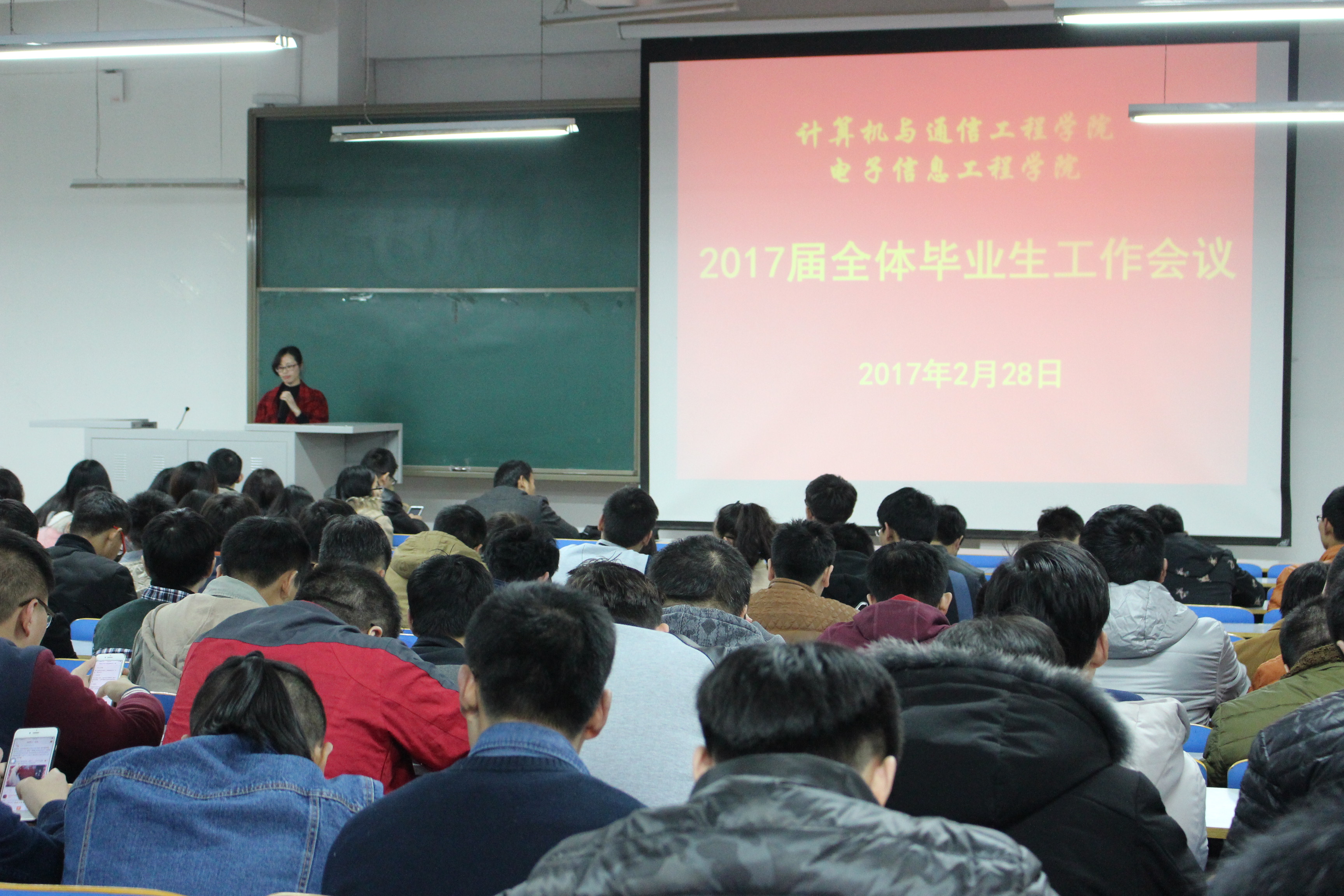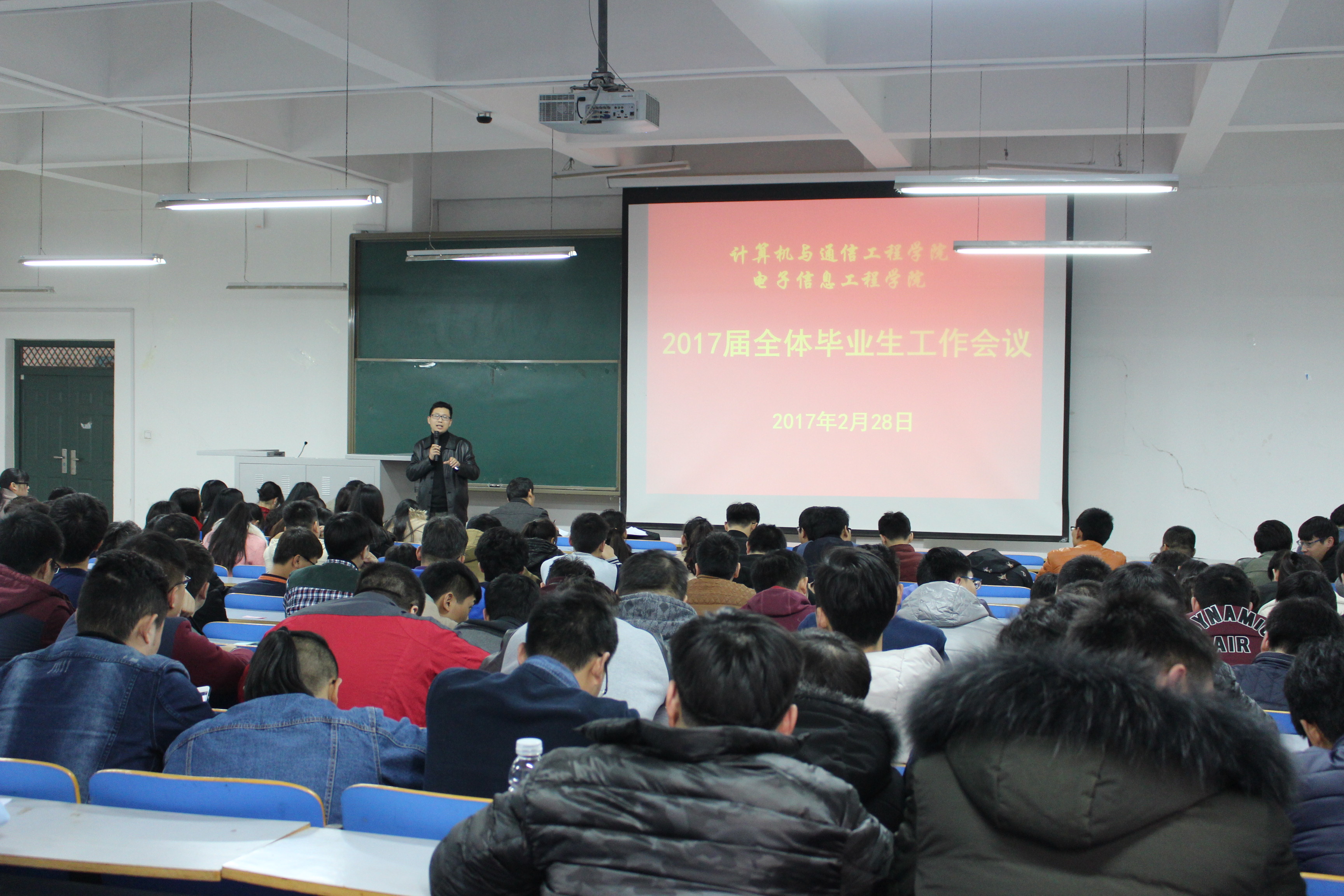 2017年2月28日下午14:30,15:30,计算机与通信工程学院(电子信息工程学院)在计算机楼118教室召开了2017届全体毕业生工作会议,学院分团委书记沈高峰老师,学院负责就业工作的辅导员欧阳杜娟老师,毕业班辅导员以及2017届全体毕业生参加了此次会议。