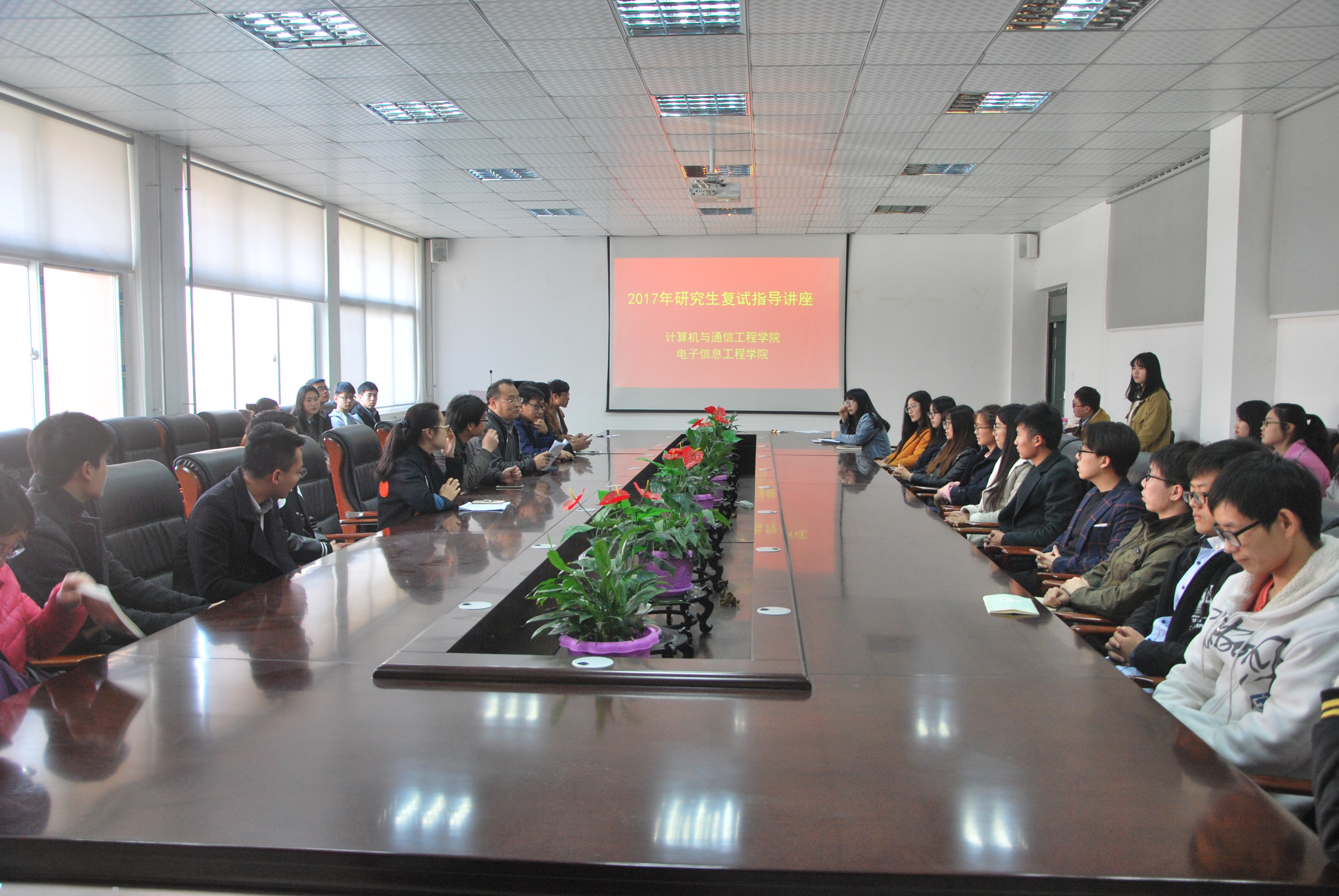 3月9日下午,计算机与通信工程学院(电子信息工程学院)在计算机楼二楼会议室召开了2017届毕业生考研复试及调剂指导会。学院副院长张素智、导师代表、新近博士代表、学工办司丽娜老师、我院在读研究生代表以及2017届的考研学子参加了本次会议。