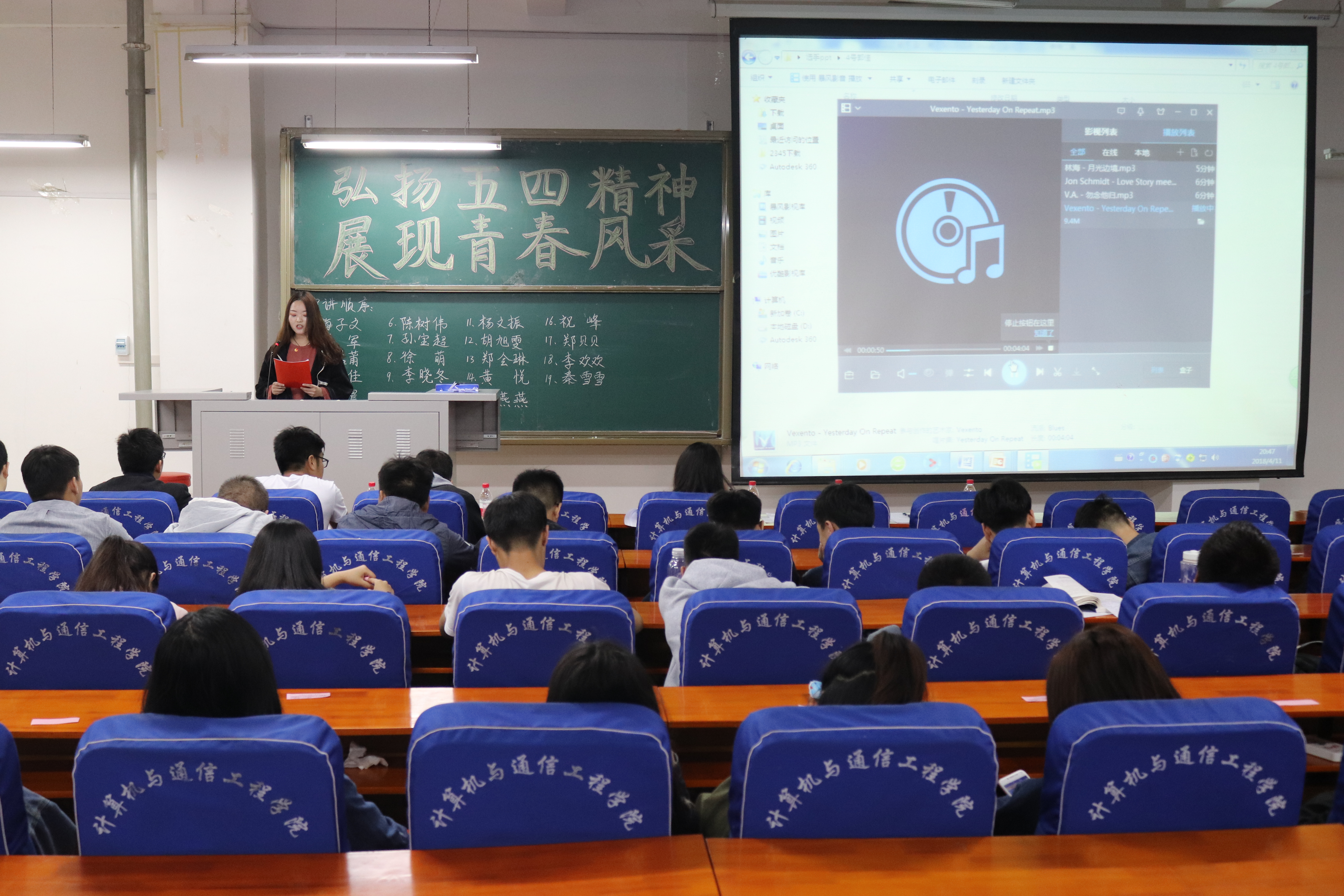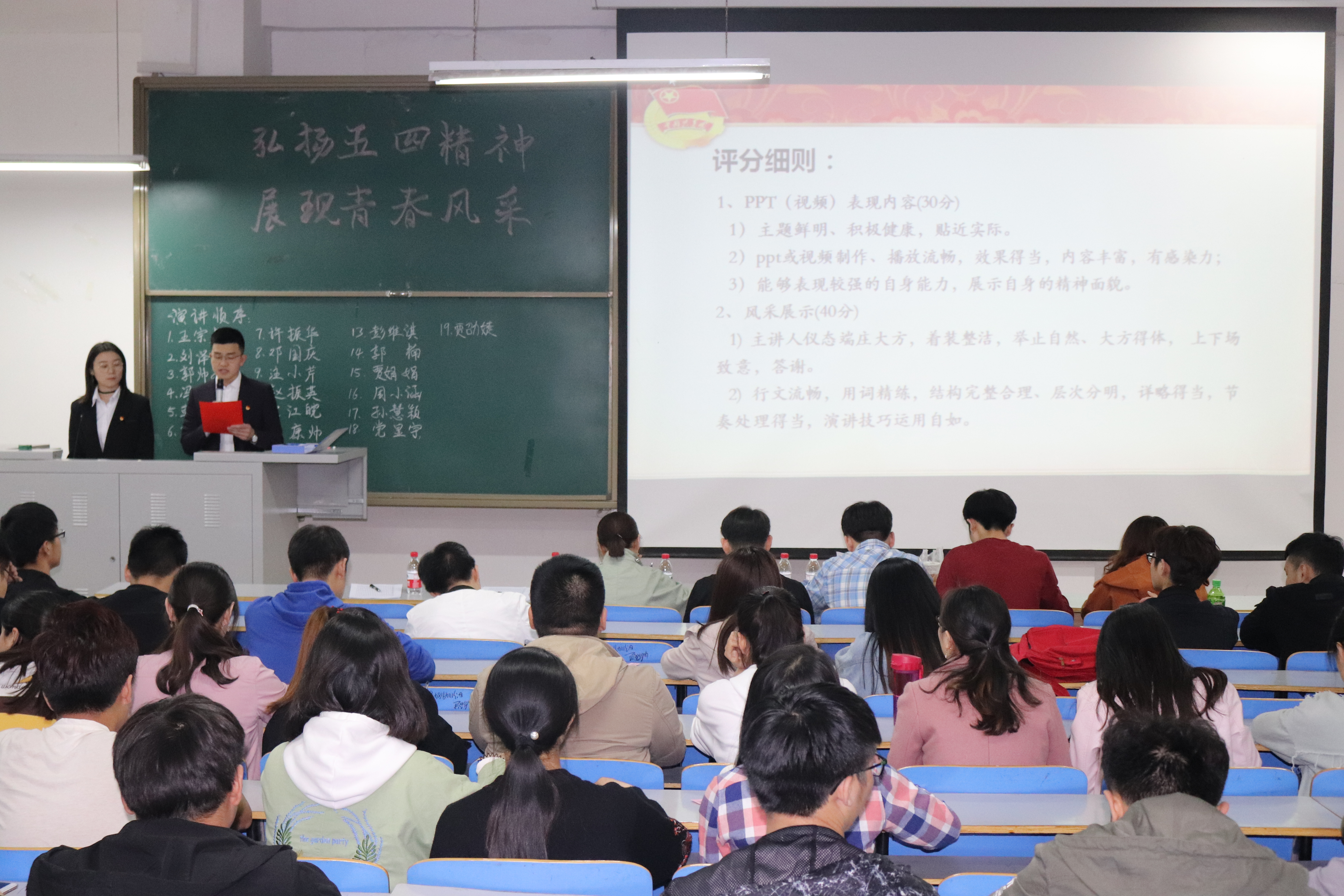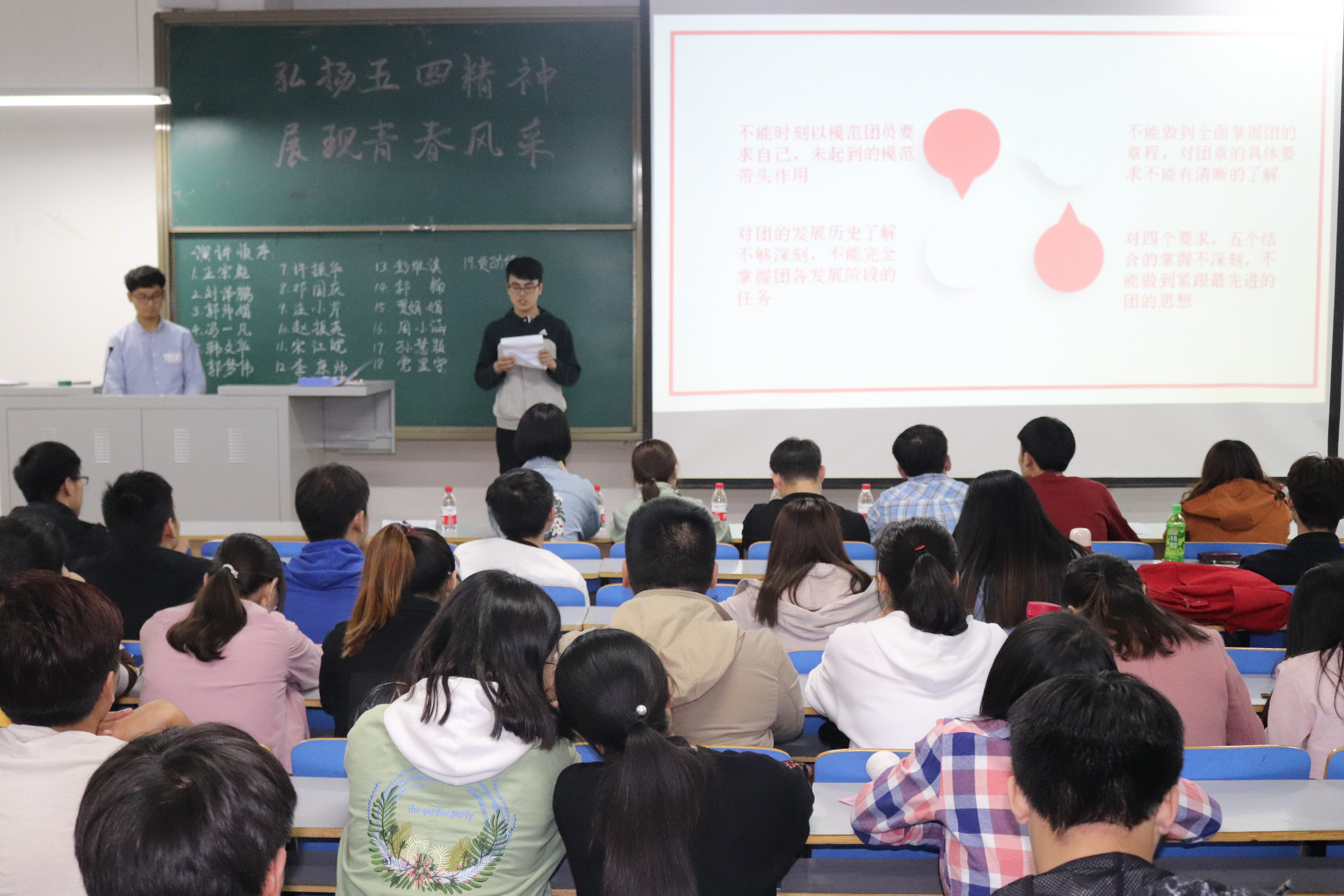 弘扬五四精神,展现青春风采“,4月11日晚上19:00,计算机与通信工程学院(电子信息工程学院)在计算机楼217、118举办“正学风 聚能量”学风建设之“弘扬五四精神,展现青春风采”五好优秀团员、五好优秀团干、五好先进团支部评选演讲答辩会。学院分团委书记沈高峰、学工办主任司丽娜、专兼职辅导员以及各团支部团员代表500余人参加了此次活动。