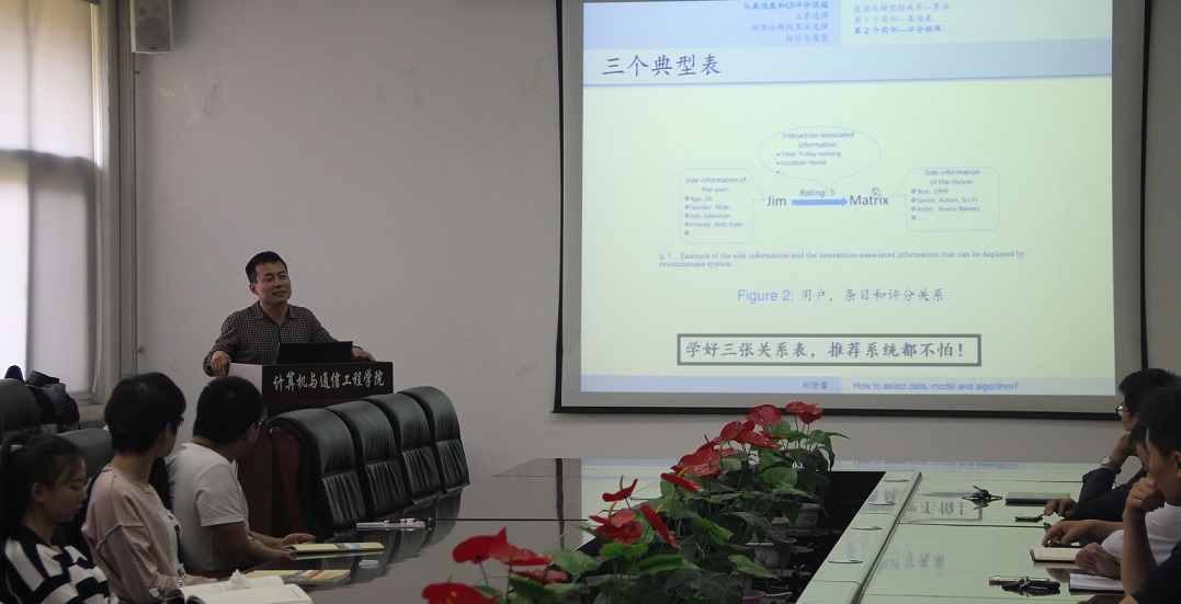 2018年5月3日,烟台大学刘惊雷教授应计算机与通信工程学院邀请,在计算机学院楼213会议室作了一场热烈而精彩的学术报告。刘教授从理论计算机科学和机器学习开始讲解,介绍了超图分解、关系分解以及矩阵分解,以及相关的重要研究内容,其中矩阵分解指的是如何将一个大矩阵(反映问题的全局视图)分解成多个小矩阵(反映子问题的局部视图)的乘积,从而降低计算问题的存储空间、提高算法的时间效率,发现数据的潜在结构。本报告基于对“数据、模型与算法”三者的概念模型和逻辑模型分析,以机器学习中广泛使用的“基于矩阵分解的数据挖掘”实例,来阐述矩阵分解在偏好推荐中的算法选择问题。本报告是对矩阵所反映的“数据表示,数据变换,空间转化,空间结构,点的运动,…”的探索和研究。 报告结束后,刘教授还与现场的师生进行了热烈的交流和互动。