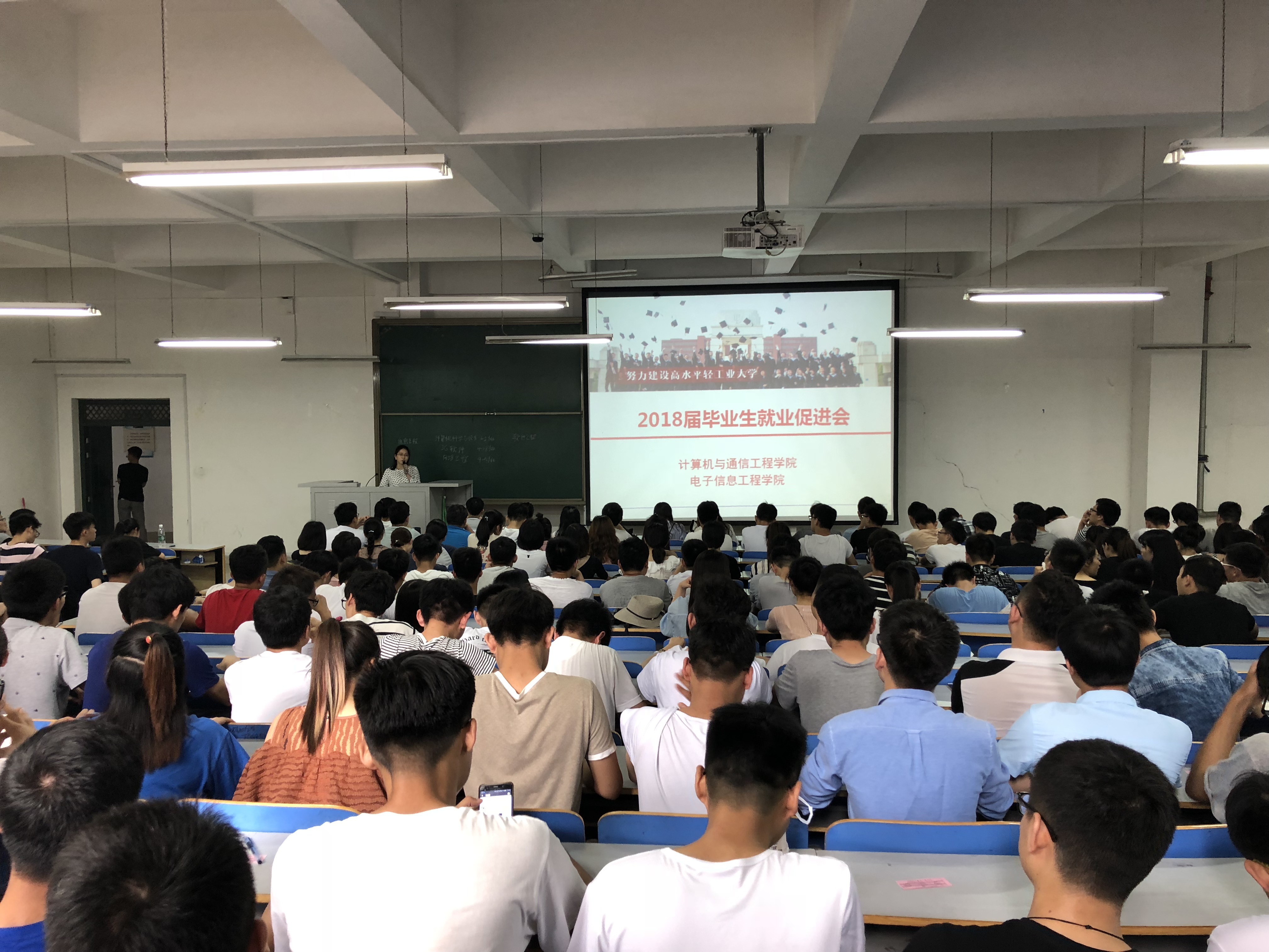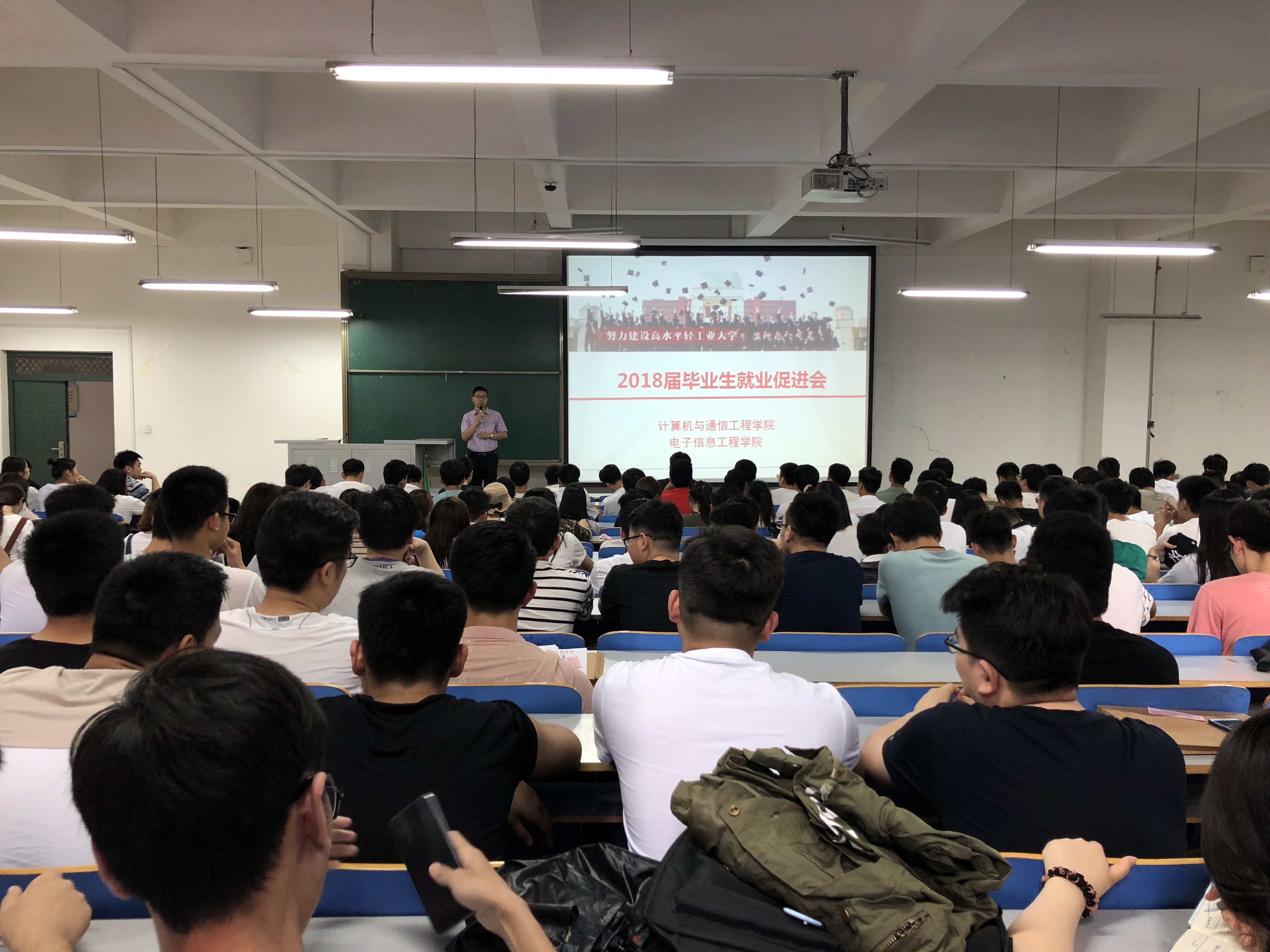 为了进一步推进2018届毕业生各项工作的开展,计算机与通信工程学院(电子信息工程学院)于5月15日下午在计算机楼118教室分三场召开了就业工作推进会,分团委书记沈高峰老师、就业专职辅导员欧阳杜娟老师、毕业班辅导员田文老师以及2018届全体毕业生参加了此次会议。