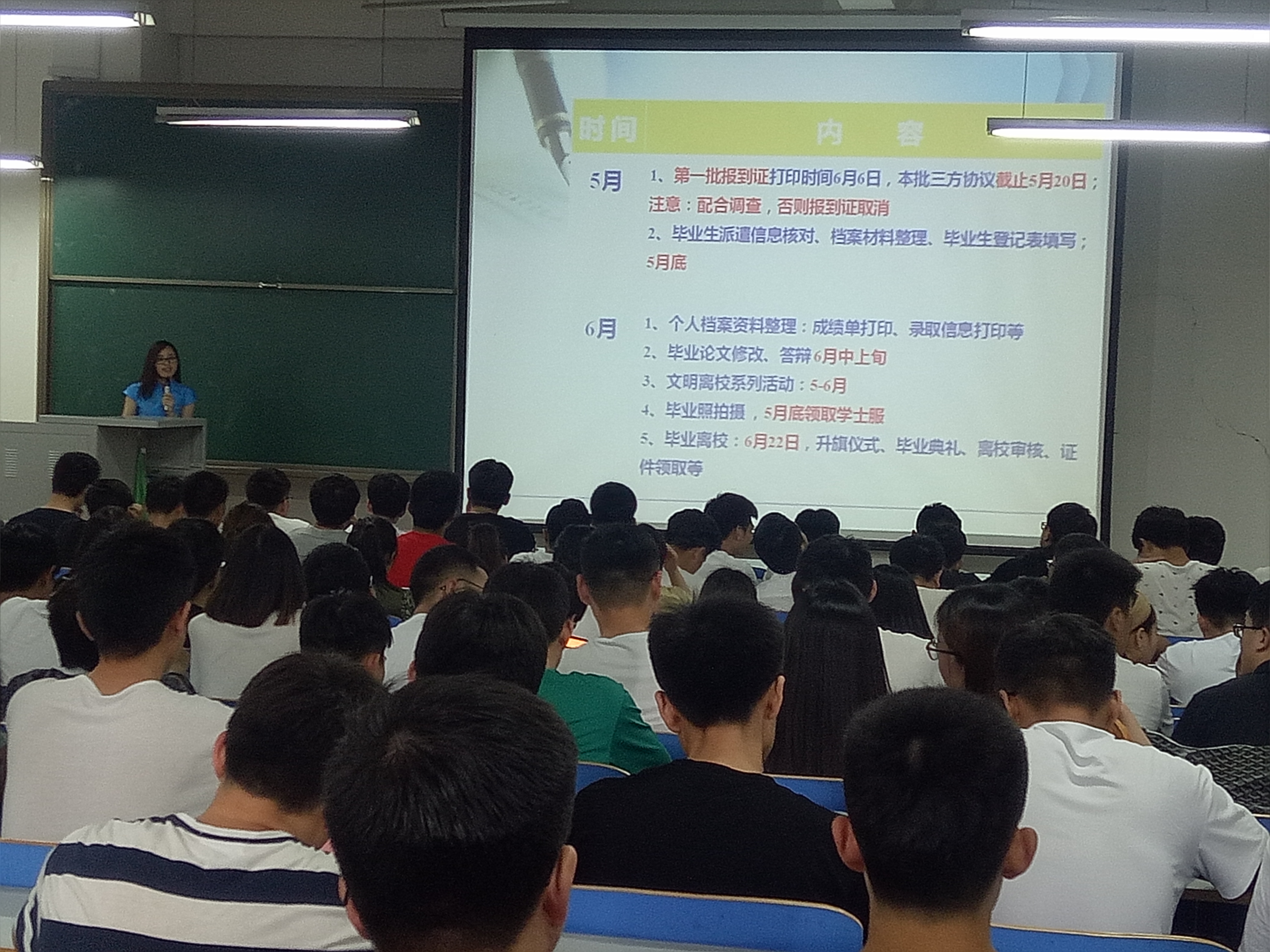随后,欧阳杜娟老师就毕业流程等相关事项进行了具体的说明,并安排了毕业前所要完成的相关事宜,包括:三方协议签订注意事项、档案派遣要求、毕业文明离校系列活动安排以及离校前学生在校期间的主要工作安排。最后,欧阳老师希望同学们在忙碌的毕业阶段要做到两点:一是遇事不焦不燥,保持良好的心态;二是怀一颗感恩的心对待遇到的人和事。