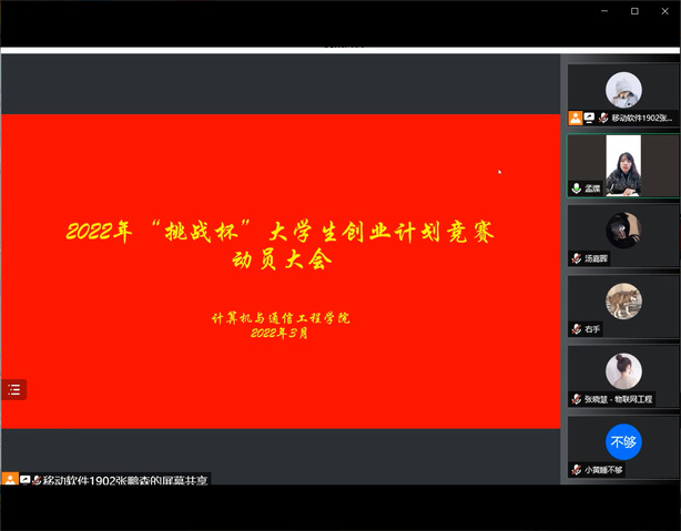 2022年3月24日下午,计算机与通信工程学院(电子信息工程学院)通过线上的方式举行2022年“挑战杯”大学生创业计划竞赛活动动员大会,会议由计算机与通信工程学院团委书记孟牒、辅导员朱妍主讲。