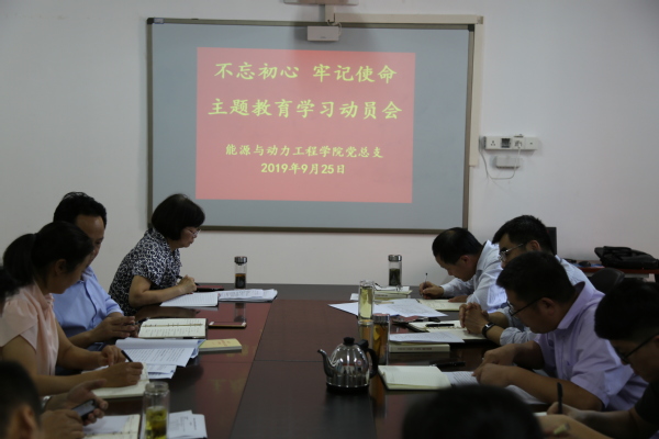 9月25日下午,能源与动力工程学院召开“不忘初心、牢记使命”主题教育学习动员会,安排部署学院主题教育工作。学院党总支全体总支委员,各党支部书记参加了会议。会议由党总支书记邵建敏主持。