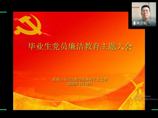 在2020届毕业生党员即将离校之际,为深入学习贯彻习近平新时代中国特色社会主义思想和党的十九大精神,积极培育和践行社会主义核心价值观,进一步引导毕业生党员廉洁修身,走好迈向社会的第一步,能源与动力工程学院于6月18日召开2020届毕业生党员廉洁教育线上专题党课,本科生支部书记宋正凯组织全体毕业生党员参加此次党课。