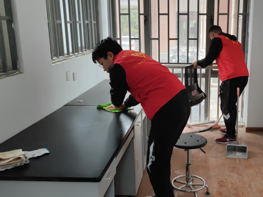 在二教楼实验室,志愿者们分工合作,认真地擦黑板、抹桌子、扫地、拖地。志愿者热情似火,不怕脏,不怕累,仔细做着每一个细节。最后,在大家的共同努力下,实验室地面清洁、黑板干净、实验桌上的实验仪器摆放整齐。看着劳动的成果,同学们满是汗水的脸上也堆满了笑容。