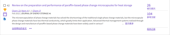 据2023年5月基本科学指标数据库(Essential Science Indicators,简称ESI)统计数据显示,吴学红课题组在储能领域期刊《Journal of energy storage》发表的综述论文“Review on the preparation and performance of paraffin-based phase change microcapsules for heat storage”被ESI数据库遴选为高被引论文。