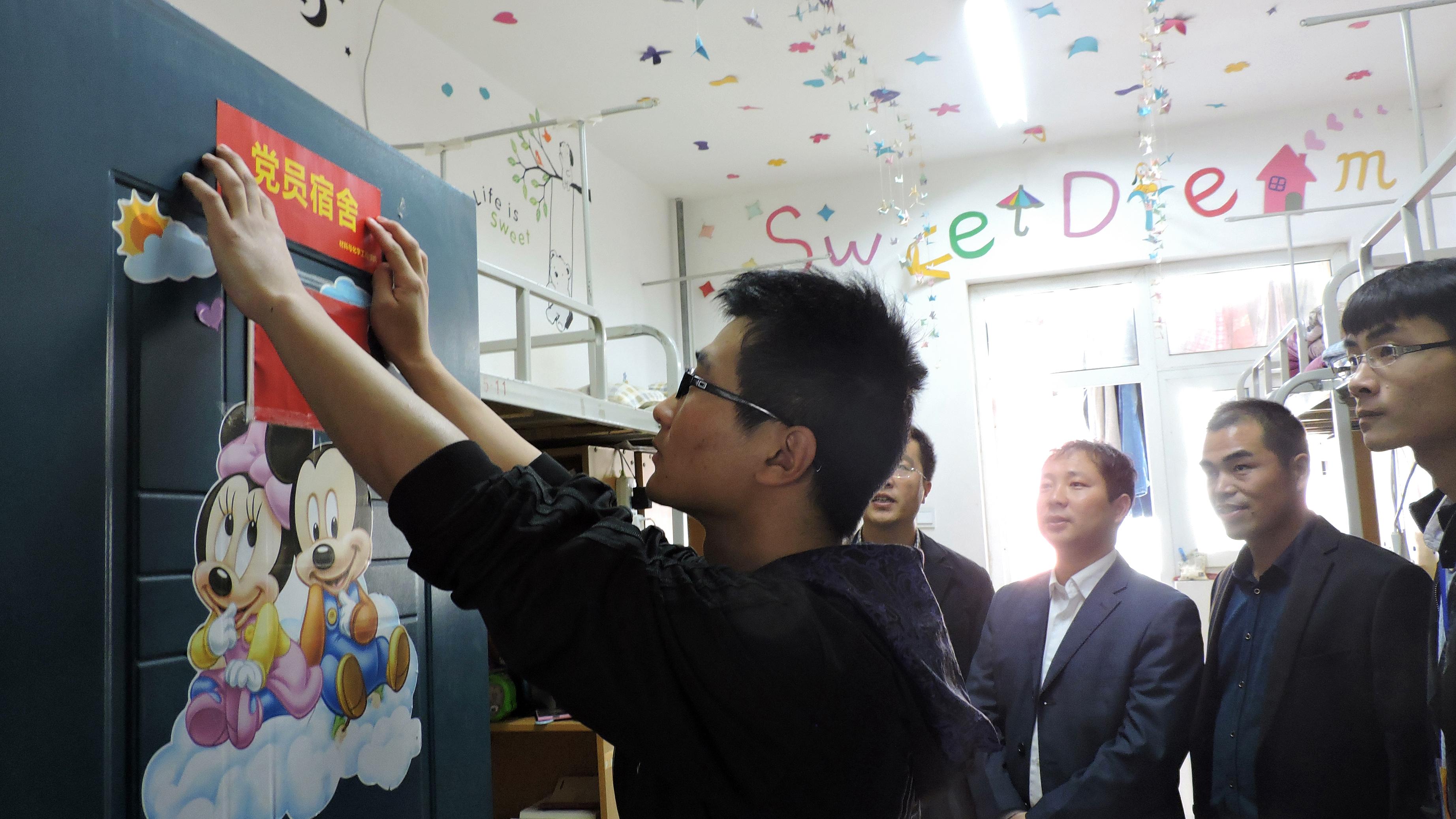 本次活动由材料与化学工程学院党总支发起,将印有“党员宿舍”的牌子贴在学生党员所在的寝室门上,每位党员不但要充分发挥模范先锋带头作用,还要以自身为旗帜,联系周边宿舍,以宿舍为基本单位,在思想政治、学习、生活、工作等方面对身边的同学进行引导和带动。在简短的授牌仪式结束后,宋德涛副书记为党员宿舍挂牌,并和全体党员一起参观了优秀学生党员宿舍,党员示范寝室的代表为大家介绍了优秀寝室的概况。