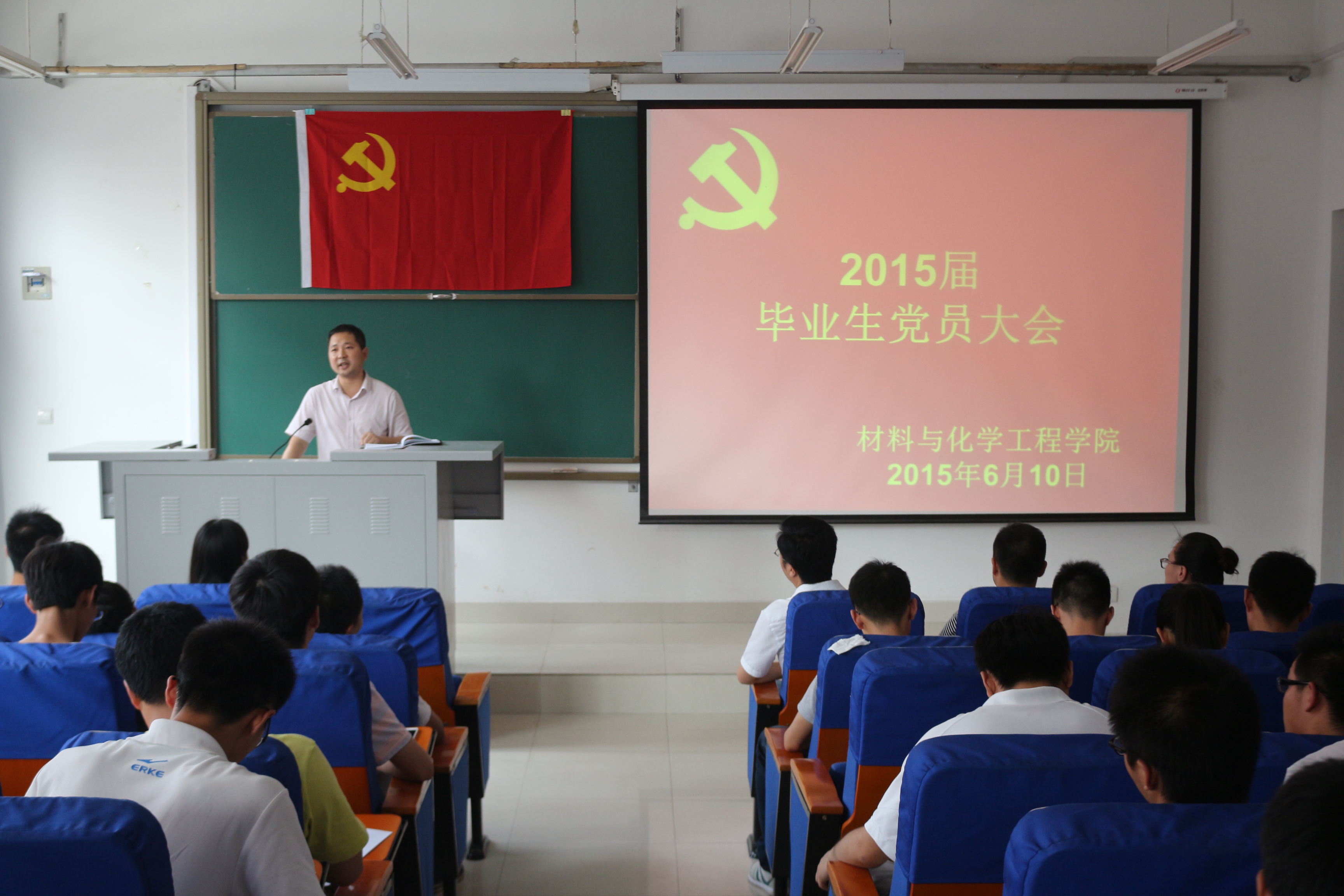2015年6月10日下午,材料与化学工程学院在化工楼218召开了2015届毕业生党员大会。学院党总支宋德涛副书记、各学生党支部书记、研究生党支部书记、毕业班辅导员及2015届全体学生党员参加了此次会议。大会由分团委书记彭东来老师主持。