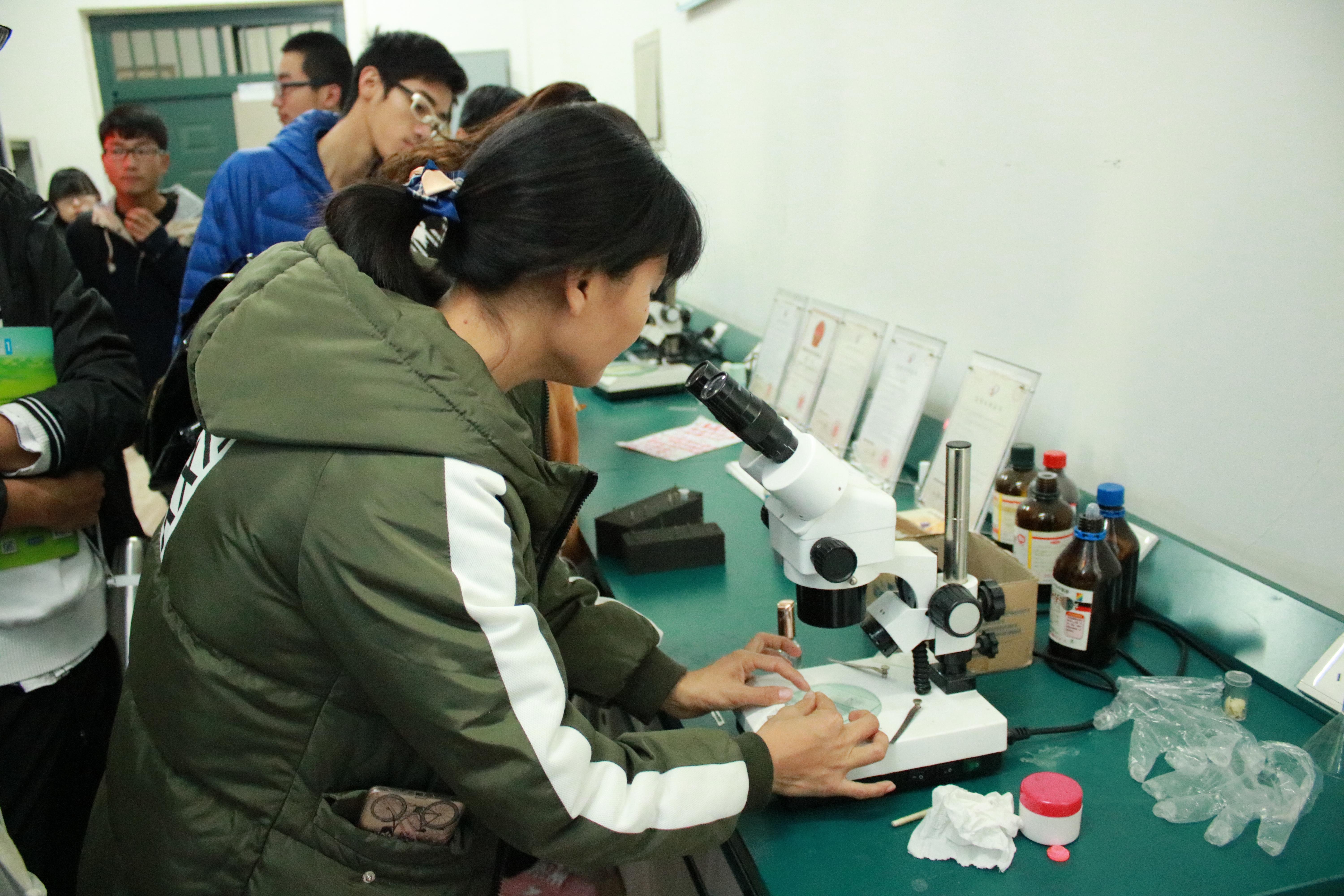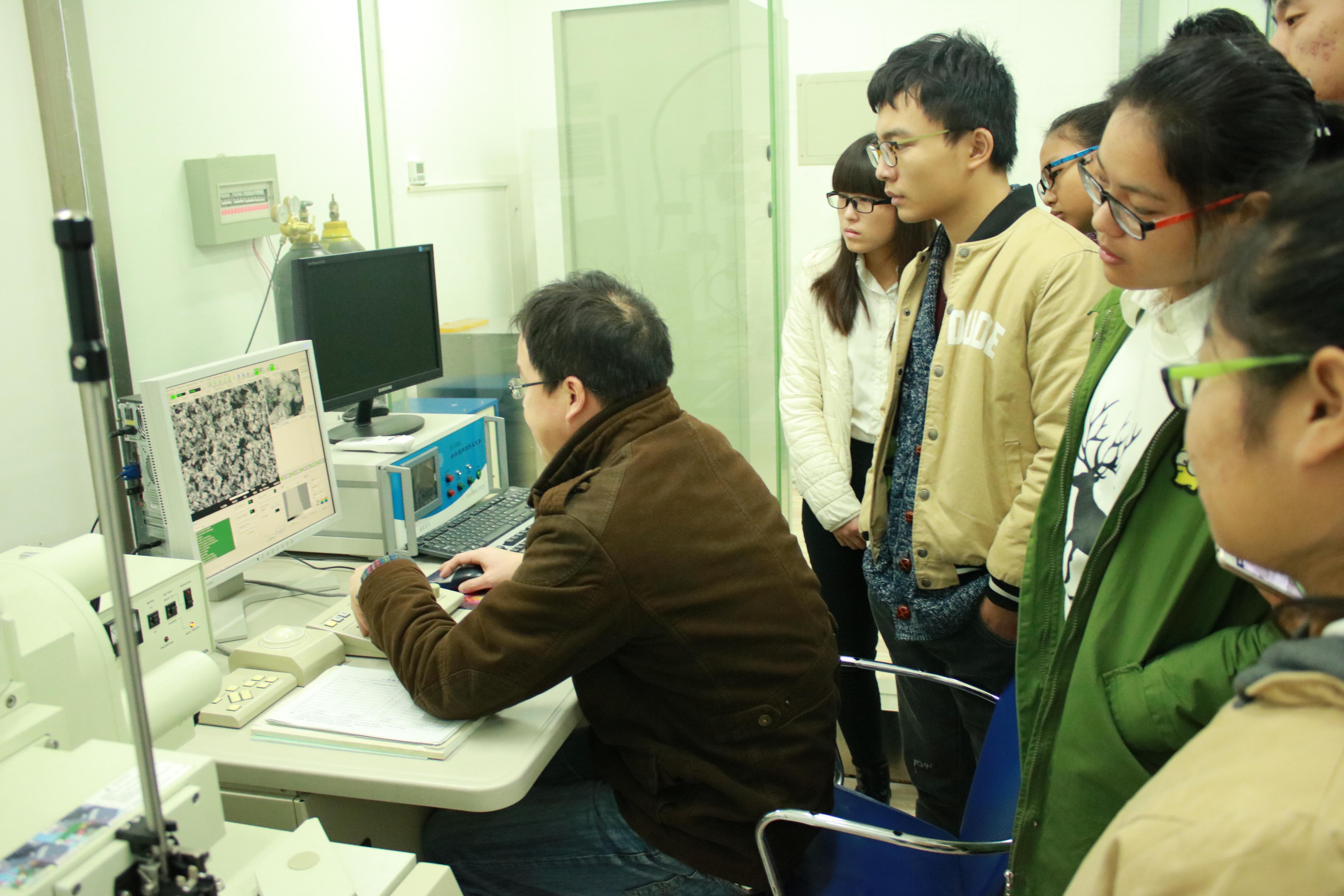 本次参观活动旨在帮助低年级学生了解学院现有的科研设施,初步掌握相关设备的功能及使用方法,为下一步的走进实验室、参与课题研究打下良好基础。参观的同学在学生会科技部人员的组织下有序进入实验室,依次参观了高分辨透射电子显微镜、扫描电子显微镜、场发射扫描电子显微镜、莱卡超薄切片机等一些重要仪器。在参观过程中,李老师极有耐心的解答同学们的问题和疑惑,她精辟的解说赢得了同学们的喝彩。科技部的干事也充当起解说员认真细致的为来参观的同学们讲解一些相关的知识,使得同学们对这些仪器的价值、主要技术参数、应用领域、使用方法等方面有了更深了解。最后参观同学和李老师合影留念,此次活动中同学们在收获知识的愉悦氛围中圆满结束。