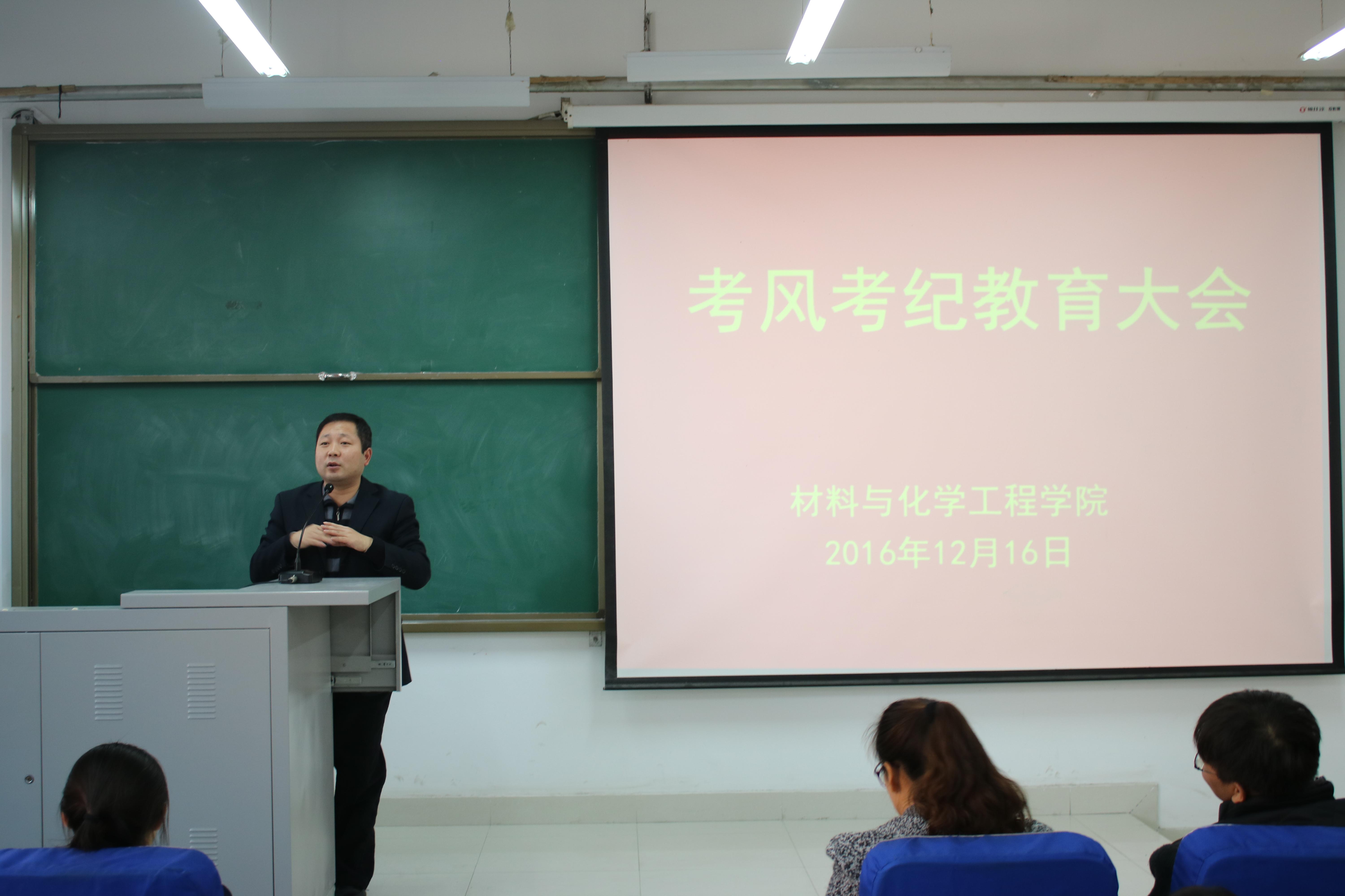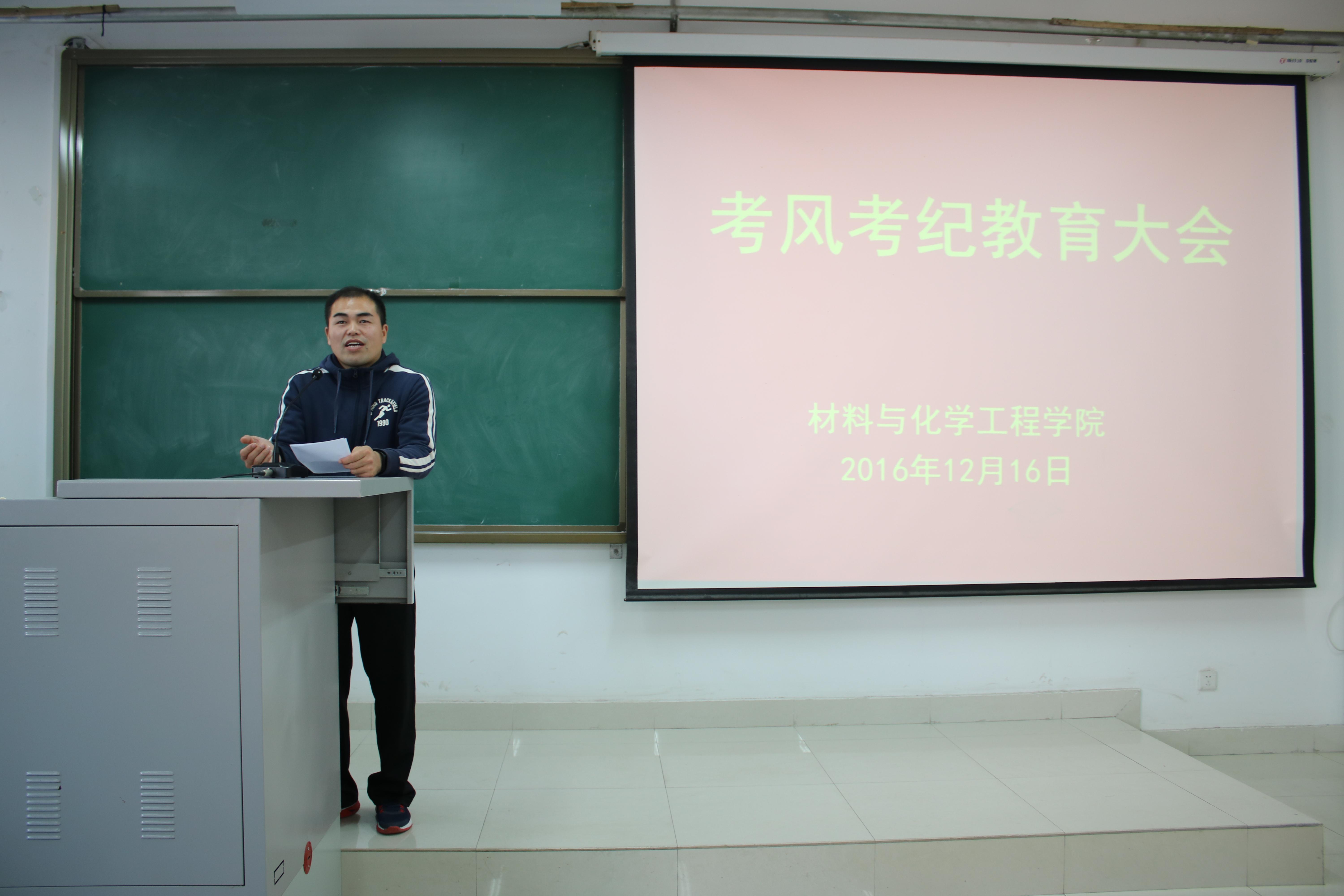 随着学期末的临近,大学生英语四六级考试、研究生入学考试也接踵而至,为引导学生树立诚信考试信念,营造积极良好的学习氛围,指导学生做好考前规划,高效科学的复习,材料与化学工程学院于2016年12月16日中午在化工楼218召开考风考纪教育大会。学院党总支副书记宋德涛老师、分团委书记朱广正老师及各班级代表参加了本次教育大会。