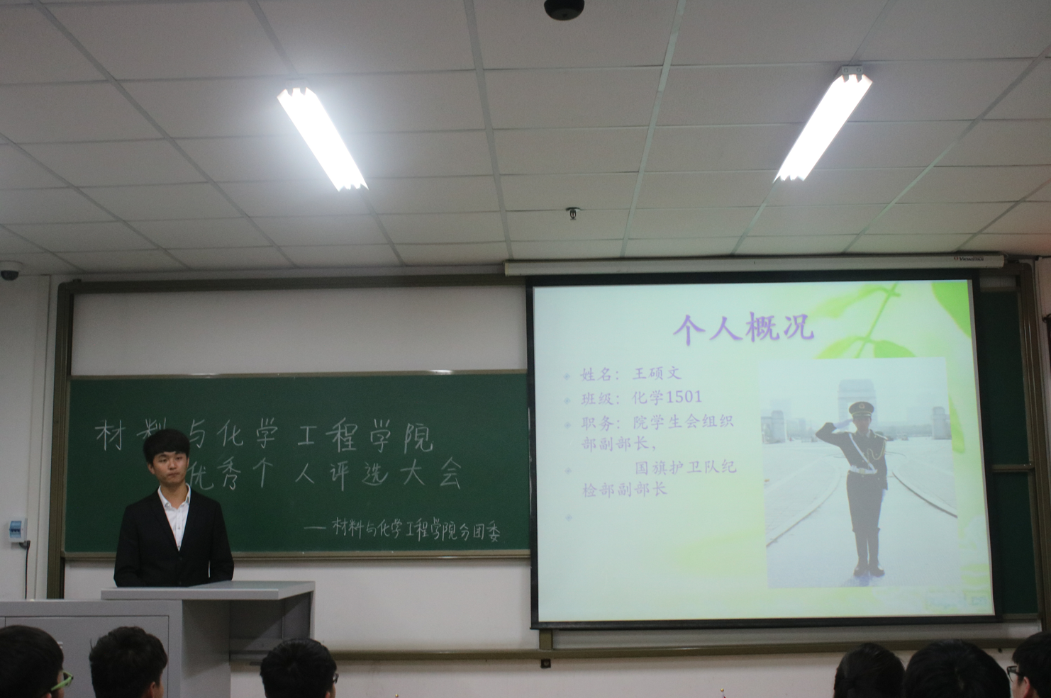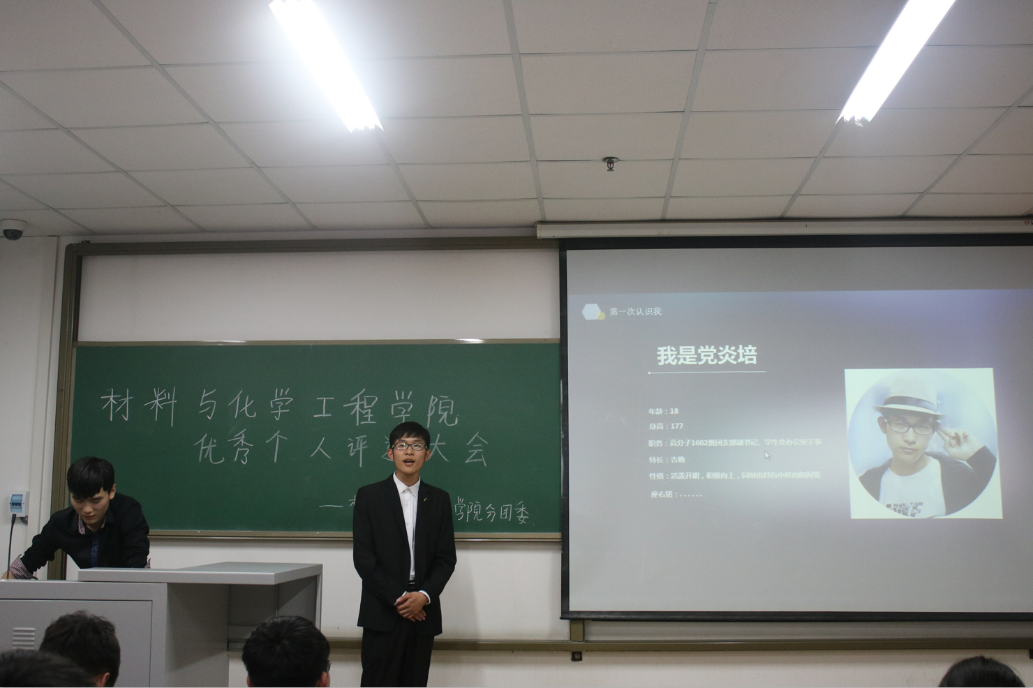 为响应校团委号召,展示和表彰2016-2017学年中涌现的综合素质过硬、模范作用突出、骨干作用明显的优秀个人以增强个人的示范导向作用,材料与化学工程学院分团委于4月17日下午六点在二教楼808举行优秀个人评选大会暨十佳团干、十佳团员答辩活动。本次活动的评委嘉宾是分团委副书记梁俊杰、学生会主席刘宇鹏及学生会各部门部长。