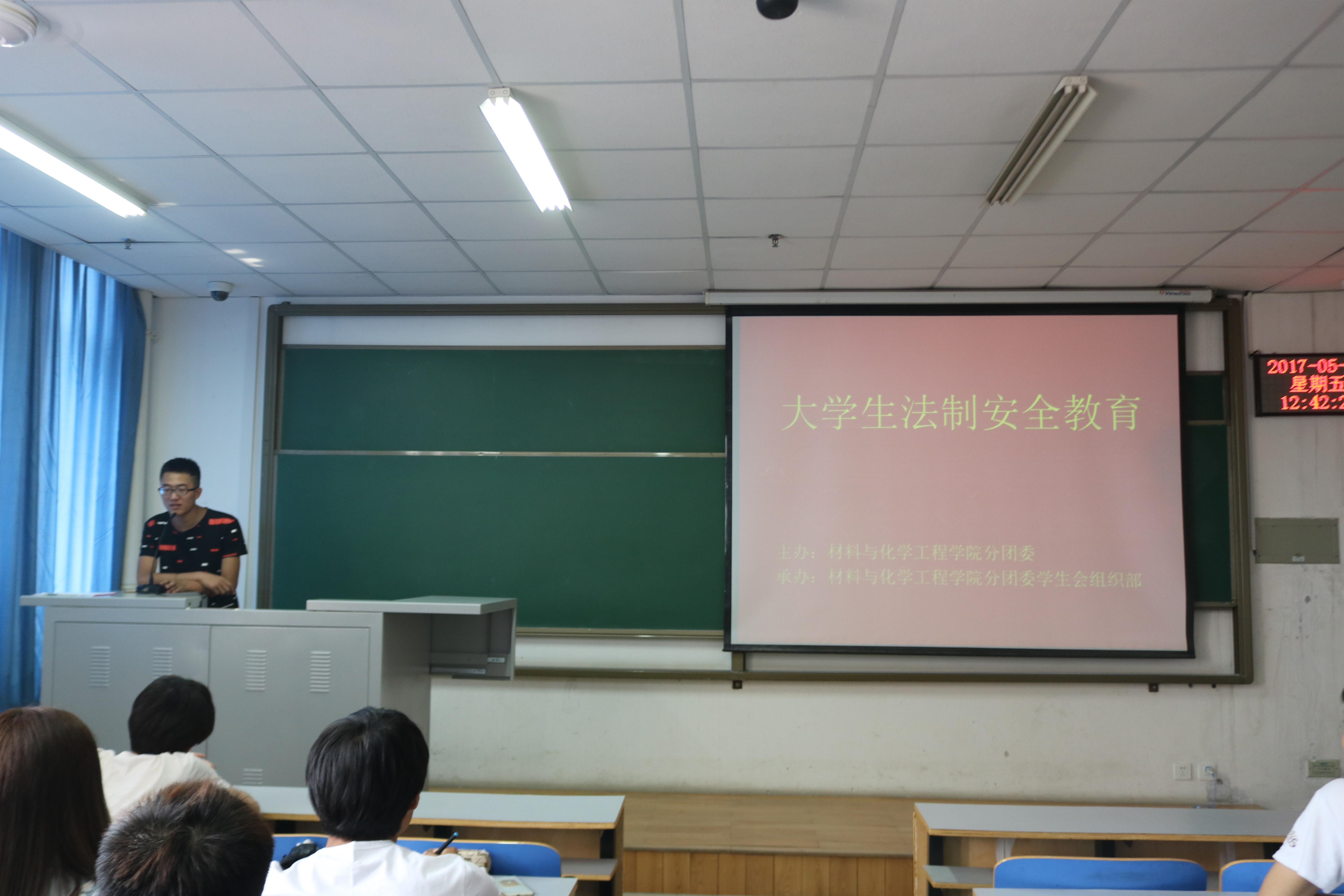 为全面提高大学生学法、用法的意识,营造安全、和谐的校园环境,2017年5月22日,材料与化学工程学院在二教楼808室举办“大学生法制安全教育会”主题活动。