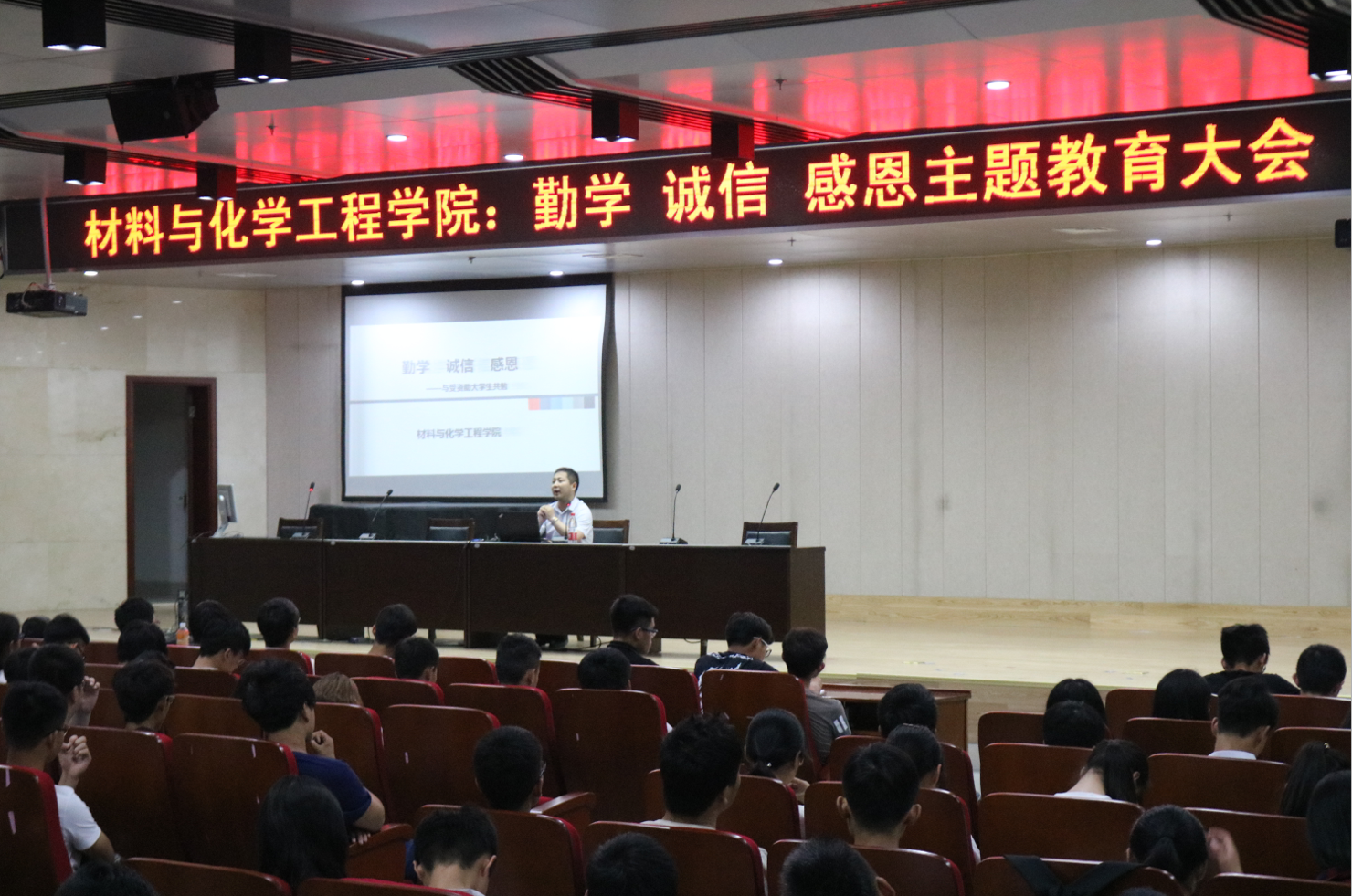 为构建大学生诚信感恩教育体系,把诚信感恩教育作为受资助学生思想道德建设的切入点和突破点,同时敦促大学生勤奋学习,推动我院资助育人工作持续健康发展,5月19日,材料与化学工程学院在科学校区图书馆报告厅召开了“勤学、诚信、感恩”主题教育大会。党总支副书记宋德涛老师、分团委书记朱广正老师、王光霁老师及本学年受资助的全体学生参加了本次会议。
