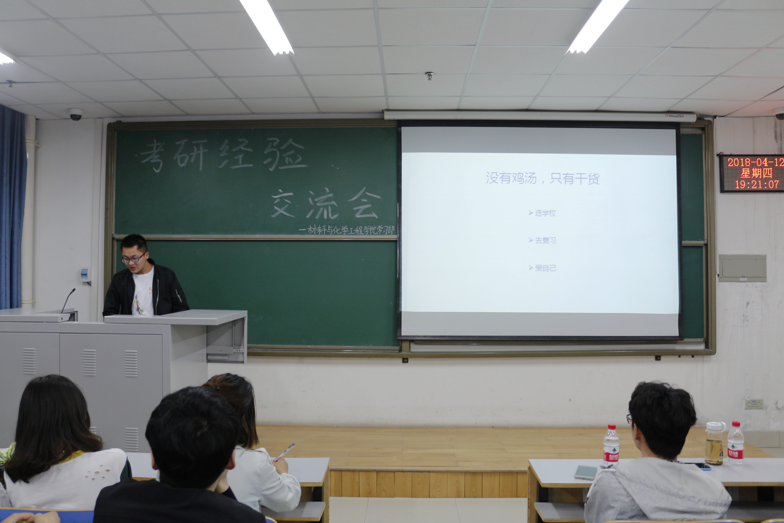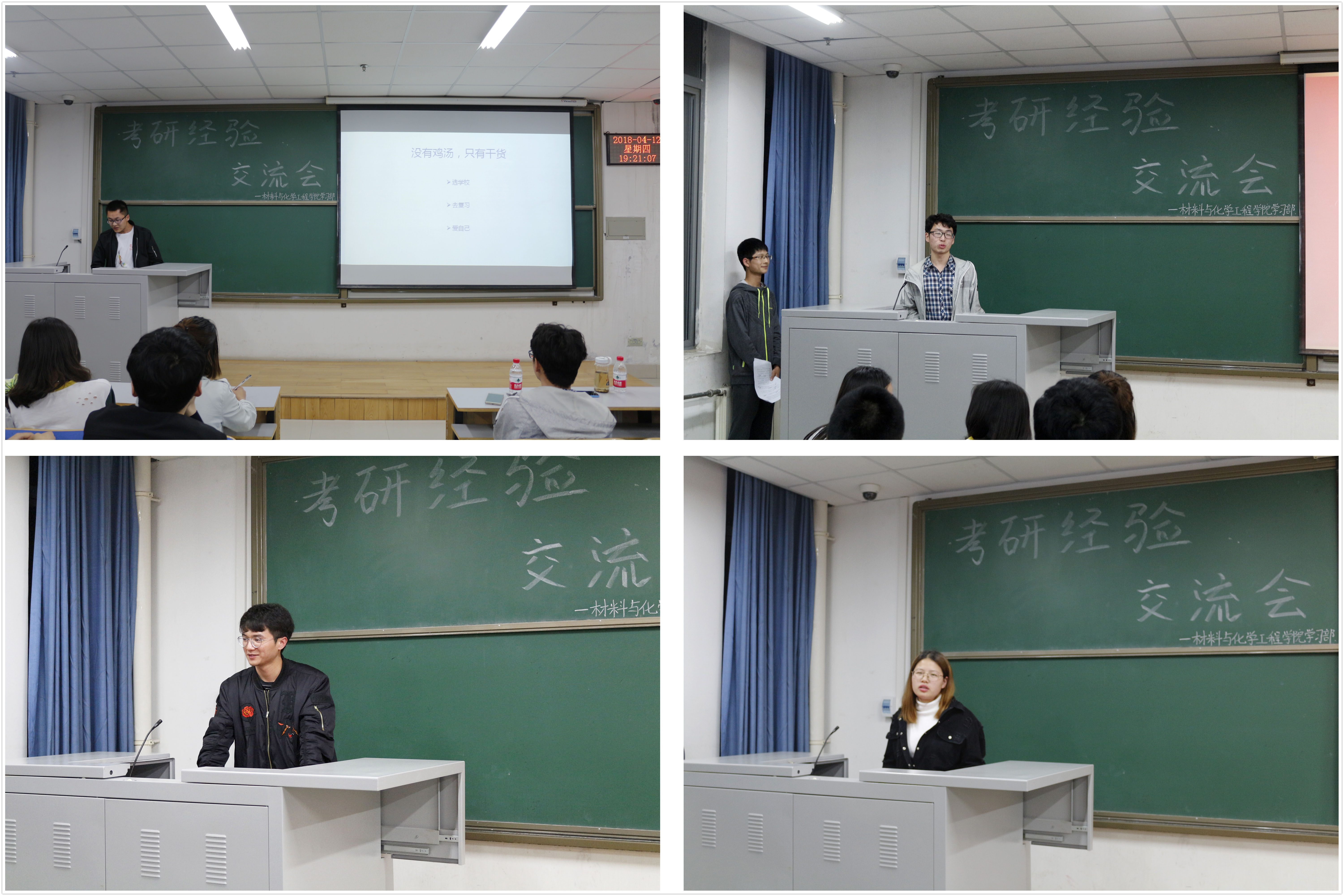 为增进大学生对考研信息的进一步了解,掌握考研技巧,更好地利用时间进行考研复习,材料与化学工程学院于4月15日晚7点在二教楼808室举办考研经验交流会。本次交流会邀请了我院2018届毕业生中考研成绩优异的李争光,肖克等人进行经验分享。