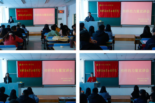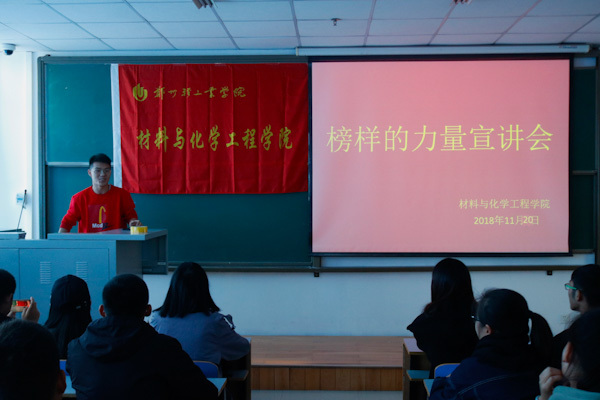 为深入学习和践行社会主义核心价值观,充分发挥大学生榜样作用,传递青春正能量,11月20日中午,材料与化学工程学院于二教808室举办 “轻院学子·榜样力量”宣讲会,学院2016级、2017级、2018级团学干部及第四届榜样之星任梦涛、党炎培参加了此次会议。