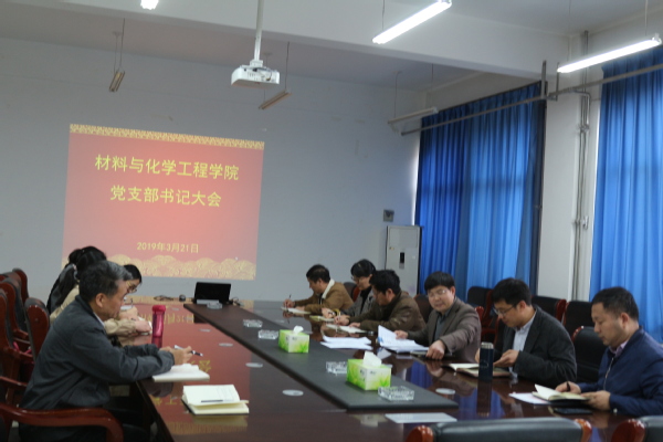 3月21日下午,材料与化学工程学院党总支在化工楼222召开党支部书记工作会议。党总支委员和各党支部书记参加。会议由党总支副书记宋德涛主持。