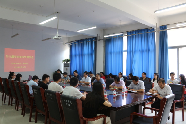 6月18日上午,材料与化学工程学院在化工楼222室召开2019届毕业研究生座谈会。学院党总支书记康国磊、院长周立明、副书记宋德涛、副院长吴诗德等党政领导班子成员、党政办主任、研究生管理办公室相关老师、硕士生导师代表以及2019届毕业研究生代表参加了本次座谈。座谈会由吴诗德副院长主持。