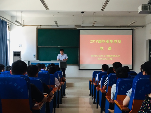 为加强毕业生党员教育,增强毕业生党员意识,引导和鼓励广大毕业生党员坚定理想信念,6月18日下午,材料与化学工程学院在化工楼218室举办“初心不改,坚定理想信念,勇担时代责任”主题毕业生党员党课。党课由党总支康国磊书记主讲,党总支宋德涛副书记、全体学生党支部书记及2019届毕业生党员聆听了党课。
