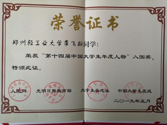 学院新闻近日,由教育部、人民日报社共同指导,人民网、光明日报社教育部、《大学生》杂志、中国大学生在线联合主办的“第十四届中国大学生年度人物推选活动圆满落幕,本次评选共遴选出“第十四届中国大学生年度人物”10名、“第十四届中国大学生年度人物”提名奖40名、“第十四届中国大学生年度人物”入围奖106名。材料与化学工程学院2015级化学工程与工艺专业李飞翰同学经过校级推荐、通讯遴选、网络展示、会议终评、结果公示等环节,最终荣获全国大学生年度人物入围奖。