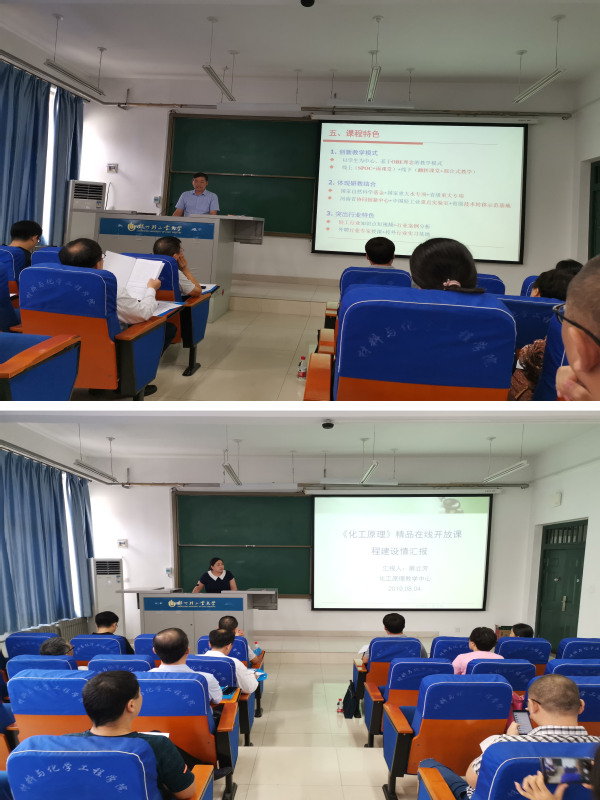 随后,王永华教授带领评审委员会专家对两门课程进行评审。评审专家们分别听取了《化工原理》、《水污染控制工程》课程组的PPT汇报,查阅了相关材料,调取了课程网络视频,对在线开放课程建设中学生使用情况、受益面等情况进行了详细的询问、核查,并针对两个开放课程提出了建设性意见或建议。与此同时,专家组还认真研究了河南省关于《2019年省级精品在线开放课程建设》的文件精神。最后,经评审委员会专家无记名投票,推荐《化工原理》课程代表材料与化学工程学院参加《2019年省级精品在线开放课程》评选。