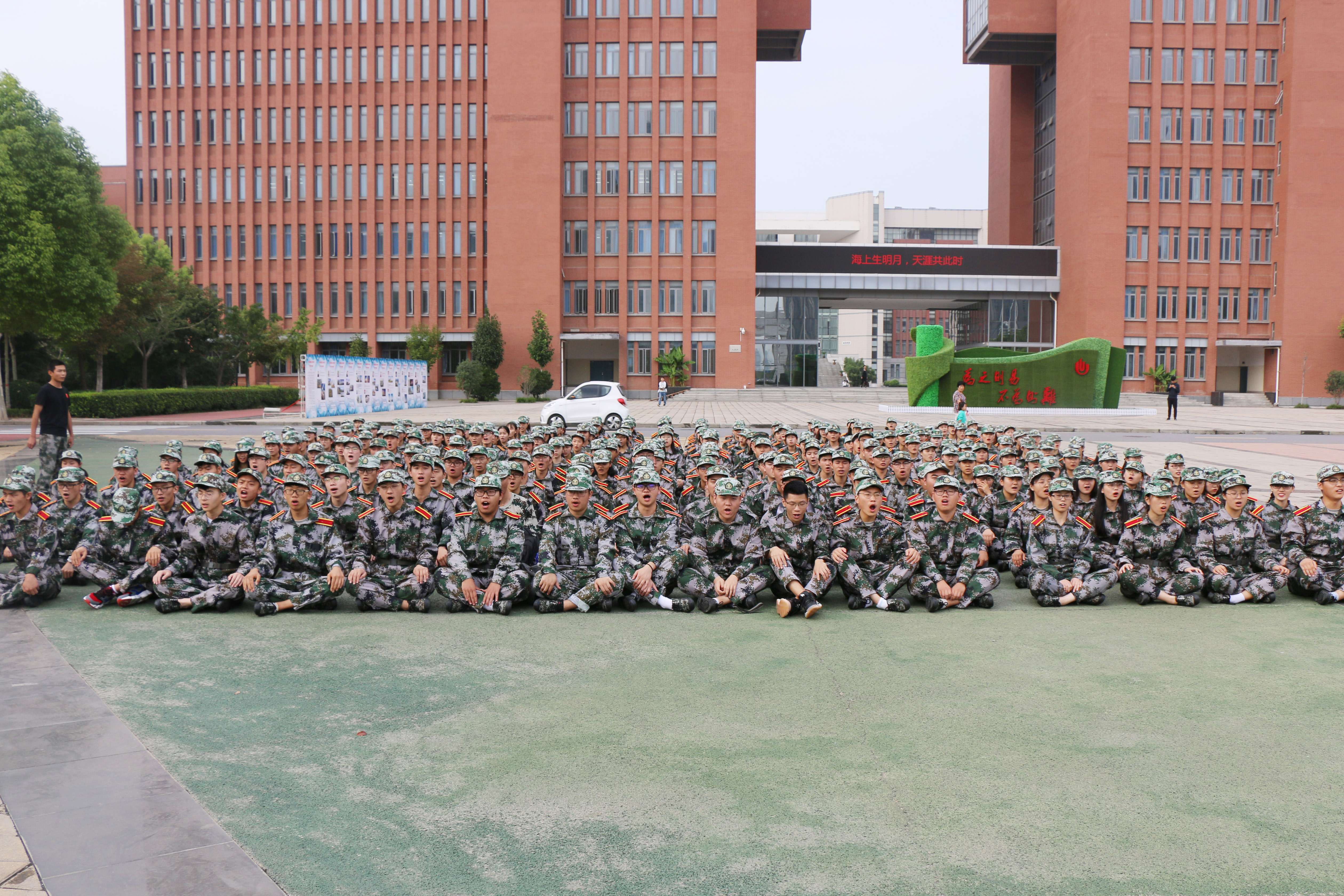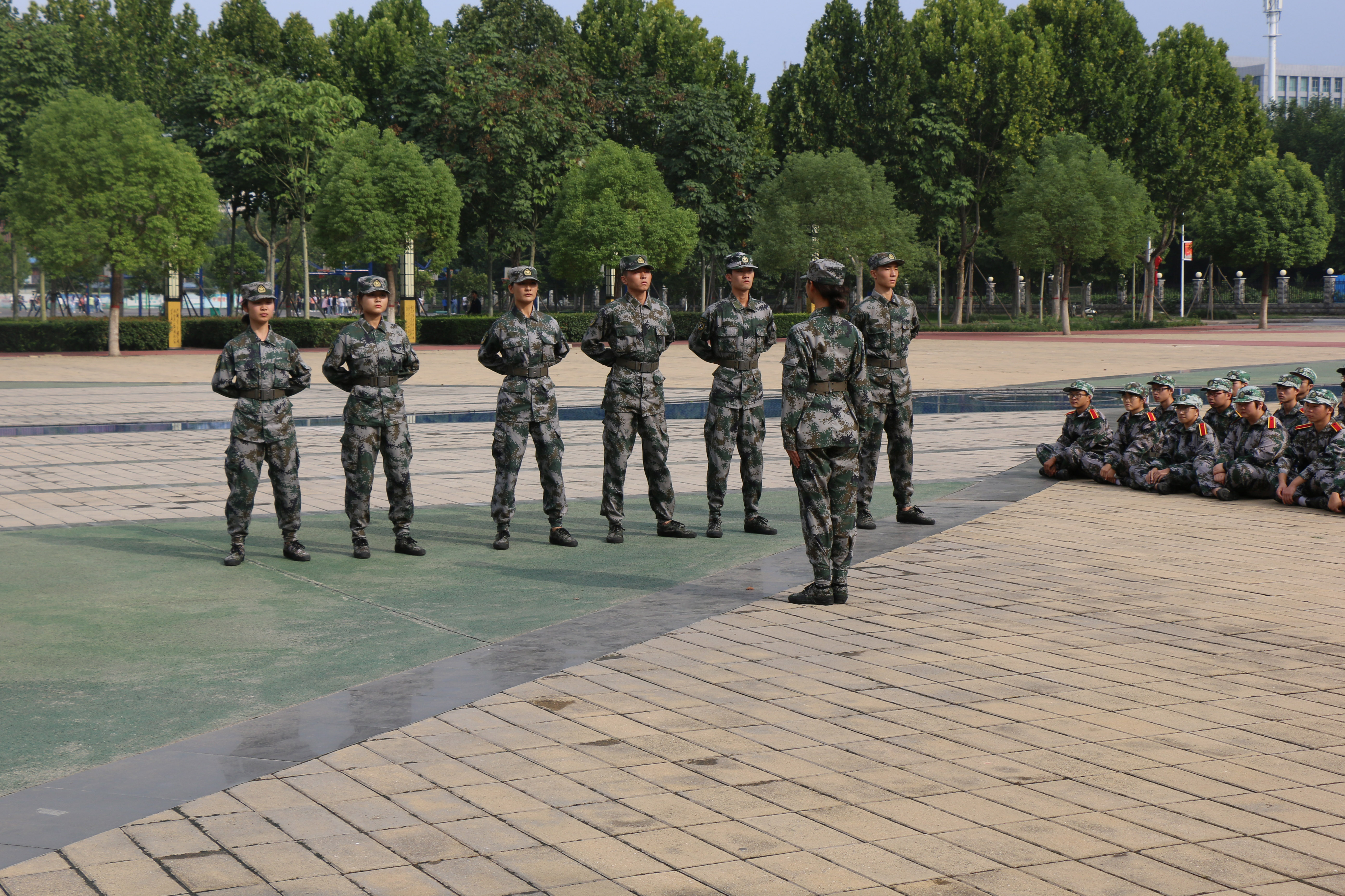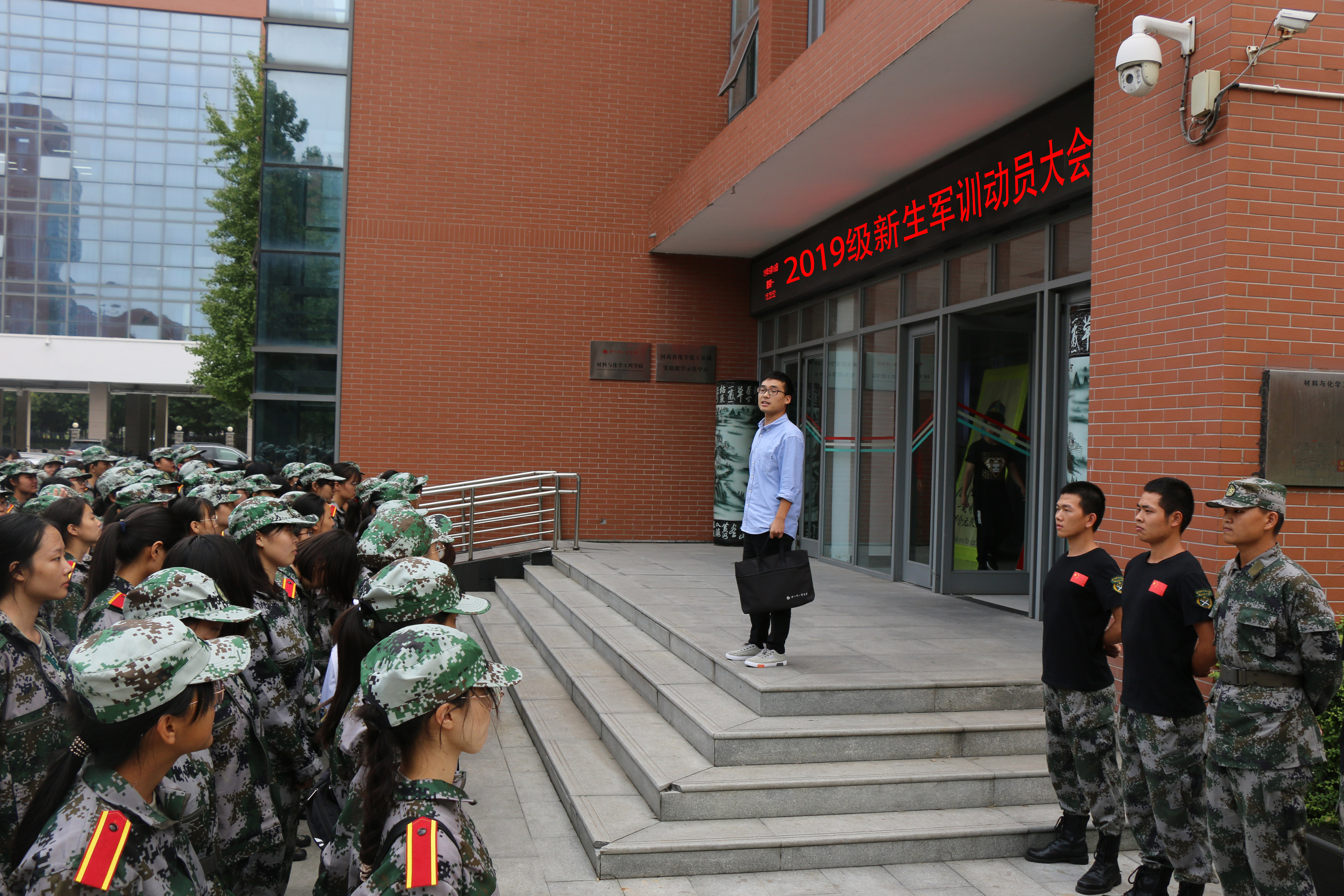 下午3点30分19级全体学生统一着军装在化工楼门前集合。首先,新生辅导员杨亚皇老师发表了热情洋溢的讲话,他要求同学们以饱满的精神状态迎接军训生活,希望同学们服从命令、听从指挥;坚忍不拔、刻苦训练;志存高远、勇于跨跃。随后,国旗护卫队成员将19级新生带至南广场,七名国旗护卫队成员向新生进行了军姿军容的简要展示。之后,我院2017级刚刚退伍的郭刚同学向19级新生演示了如何进行仪容仪表的整理并带领同学们一起学习了军歌《团结就是力量》,嘹亮的歌声响彻校园,坚定有力的步伐展示了定能圆满完成军训任务的决心和信心。