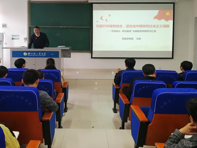 为推进“不忘初心、牢记使命”主题教育重点工作,根据校党委“不忘初心、牢记使命”主题教育安排,10月17日下午,材料与化学工程学院在化工楼218室举行了“不忘初心、牢记使命”主题教育专题宣讲会,宣讲会由党委讲师团马寒老师主讲,我院全体教工、学生党员参会。