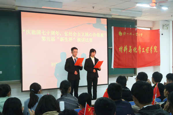 为庆祝新中国七十华诞,培养同学们的爱国主义热情,践行社会主义核心价值观,10月17日下午,材料与化学工程学院于科学校区二教916室举办“庆祖国七十周年华诞,弘社会主义核心价值观”新生演讲比赛,演讲与口才协会会长、学院主要学生干部担任比赛评委,19级同学参加了此次活动。