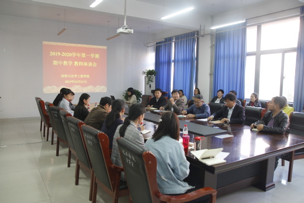 2019年10月31日下午,材料与化学工程学院在化工楼222会议室召开本学期期中教学教师座谈会,学院领导班子成员、各系部(中心)教师代表及教学秘书参加了座谈会,会议由教学院长尹志刚教授主持。