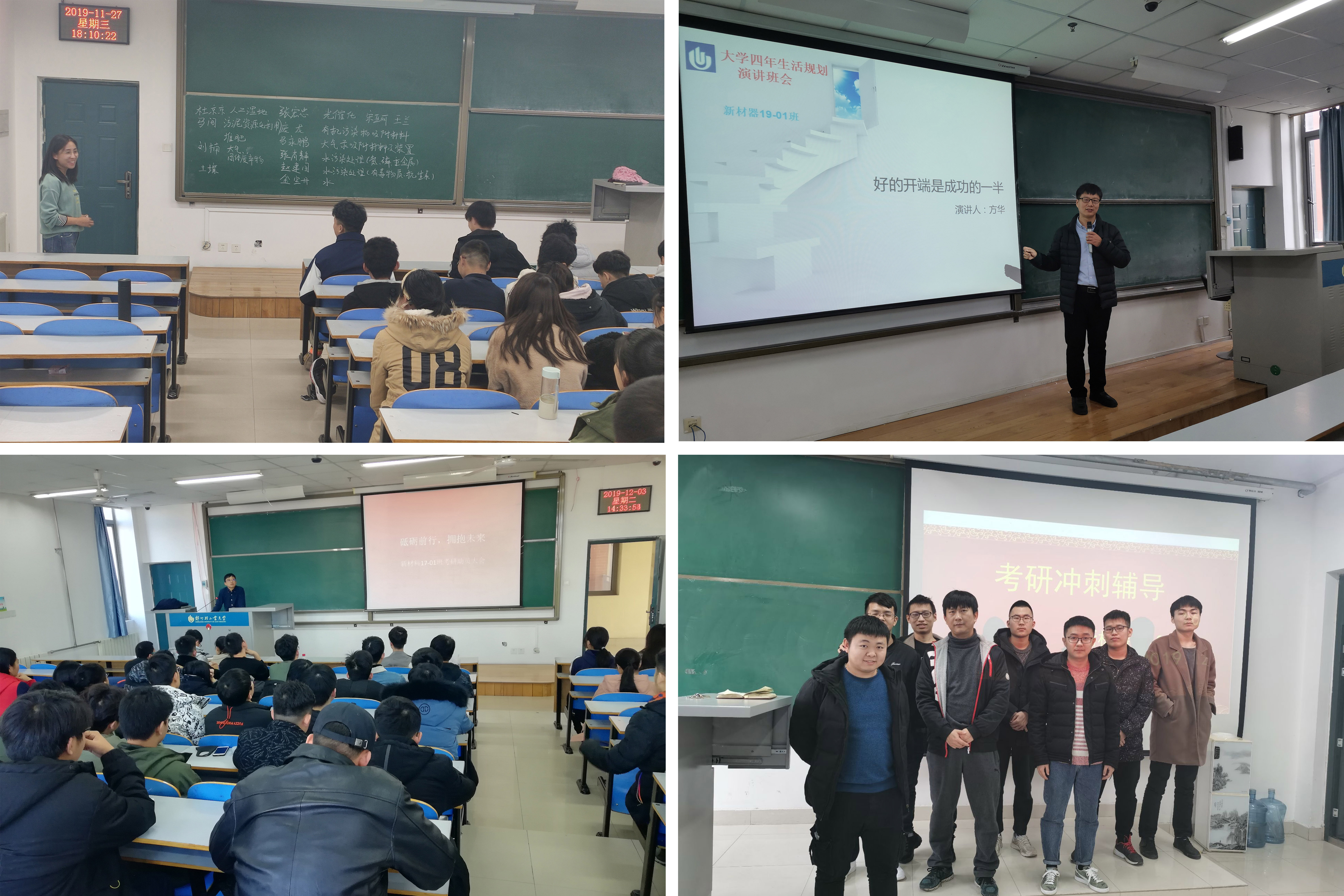 初心是起点时心怀的承诺与信念,是困境时履行的责任与担当。在12月上旬,环境工程19-02班班主任张珂老师召开“一分耕耘,一分收获”的主题班会,组织同学们写下每个学期的小目标、小期许,鼓励大家坚定自己的信念,通过完成一个个小目标,不怕辛苦,不怕困难,向着美好的梦想前行。在新材器19-02班,班主任宋延华老师召开以大学规划为主题的系列班会,阐述规划和目标的关系,通过有计划的开展班会,检查大家的规划完成情况。应用化学19-02班班主任秦肖雲老师、新材器19-01班的方华老师、新材器16-01班的魏巍老师,也分别通过开展主题班会的形式讨论了同学们为什么要学习、学习目标的制定、学习习惯的养成、如何克服学习上的困难等方面问题,并建议大家把“初心”内化于心,细化于行,牢记使命,追逐梦想,扬帆远航。