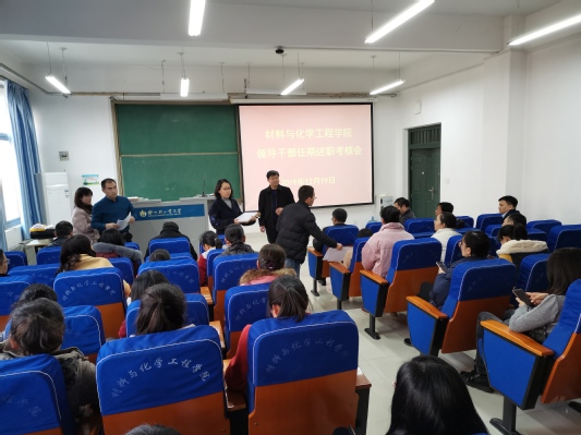 12月19日下午,材料与化学工程学院在化工楼218室召开了院领导班子和领导干部任期考核述职暨民主测评大会。校纪委副处级纪检员崔建平和学院教职工参加了大会,会议由党总支书记康国磊主持。