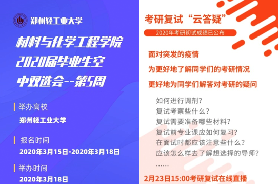 精心组织,推进线上就业招聘。学院通过《材化与化学工程学院致用人单位一封信》与130多家单位联系,邀请用人单位参加学校线上招聘会。同时,学院发挥校友企业力量,提供高质量就业岗位。3月15日至3月21日,举办第五周专场“云招聘”,学院从报名企业中精选10家企业参会,提供60个职位、400余个岗位,累计300余位毕业生参加。