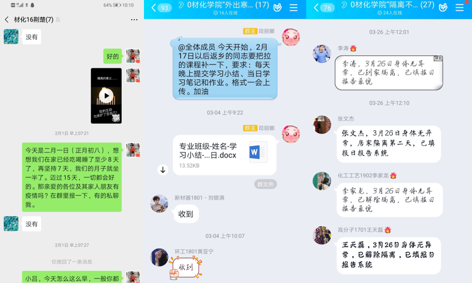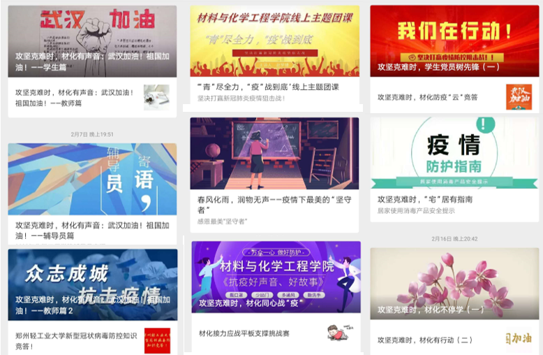 新冠肺炎疫情发生后,材料与化学工程学院化“疫情危机”为“教育契机”,把疫情当教材,把灾难当课堂,把思想政治工作这把盐渗入到疫情防控全过程,教育引导青年学子敬畏规则、责任担当、科学防控、规划成长、自信自强,与民族共患难、与祖国共成长。