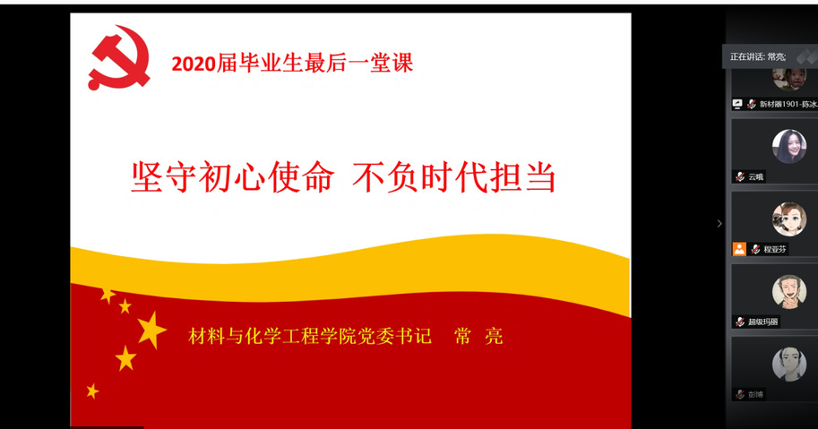 学院党委书记常亮以“坚守初心使命不负时代担当”为主题,为毕业生党员讲授了最后一次党课。常书记对学生即将顺利完成学业、走上新的人生旅途表示热烈祝贺。她用详实的数字和鲜活的事例,讲解了“疫情下的中国力量”,以材化学院学生党员一线抗疫故事,生动阐述了学生党员“疫情下的责任担当”。常书记寄语毕业生党员,一要养成终身学习的习惯,向书本学习、向实践学习、向身边人学习,将学习精神融入生活工作的点滴之中;二要保持敬畏之心,不忘初心使命,永葆共产党员的先进性,在未来工作学习中认真做好本职工作,发挥先锋模范作用;三要把廉洁作为一种信念、一种追求,把廉洁的操守带到今后的工作中,树立正确的职业观,不断提升党性修养,以实际行动做社会主义合格建设者和接班人。