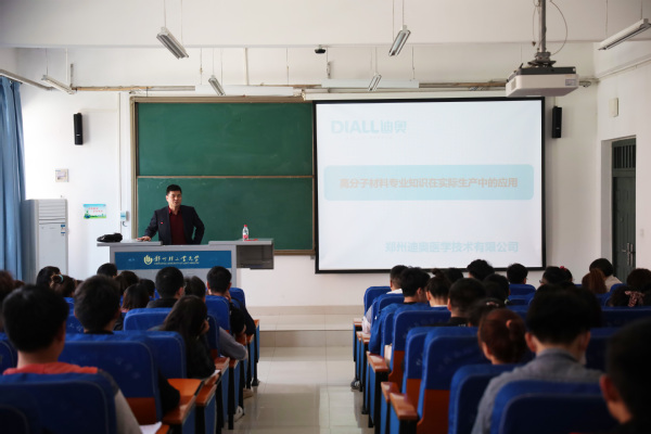 4月29日,材料与化学工程学院在化工楼218举办了创新创业大讲暨“知行讲堂”。本次活动特邀高分子材料与工程专业1995届校友、郑州迪奥医学技术有限公司荆文普董事长做题为“创新造就未来——高分子材料在生产中的应用”的报告。高分子专业课教师和高分子材料与工程专业学生共近200人参加了此次活动。