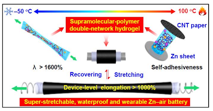 本研究通过将非共价键自组装的鸟苷超分子网络引入到共价交联的聚合物网络中,首次设计构筑了一种小分子基超分子-聚合物双网络(SP-DN)水凝胶电解质,并成功将其应用于高拉伸、防水和宽温域锌-空气电池中。该锌-空气电池具有> 1000%设备级水平的拉伸率和出色的防水性,并且能够在―50至100 ℃正常稳定工作。该研究为高拉伸和环境适应性能源供给设备的水凝胶电解质的设计提供了一种新的思路。