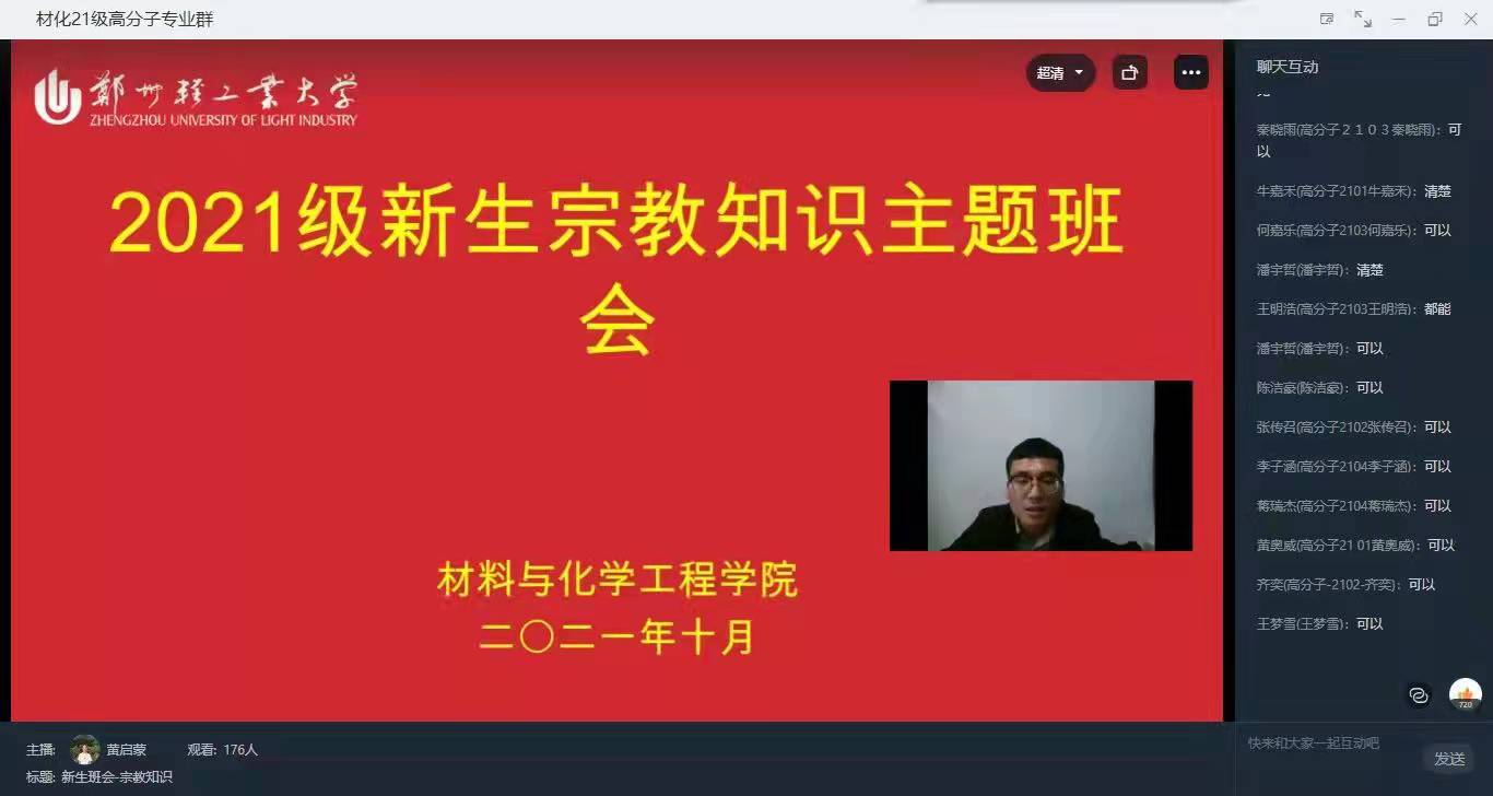 为深入贯彻落实党的民族宗教工作方针政策,帮助学生树立崇高的理想信念,提高正确认识和对待宗教问题的能力。近期,材料与化学工程学院通过线上开展入学教育活动之“民族宗教知识”主题班会。学院党委副书记司丽娜、团委杨亚皇老师及新生班级辅导员参加本次活动。