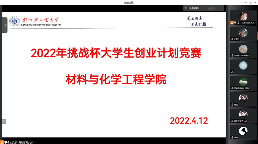为培养大学生科技创新兴趣,提高实践创新的能力,近日,材料与化学工程学院举办2022年“挑战杯”大学生创业计划竞赛线上答辩和线下评审会,学院党委副书记司丽娜、副院长张永辉及部分专业教师担任评委。