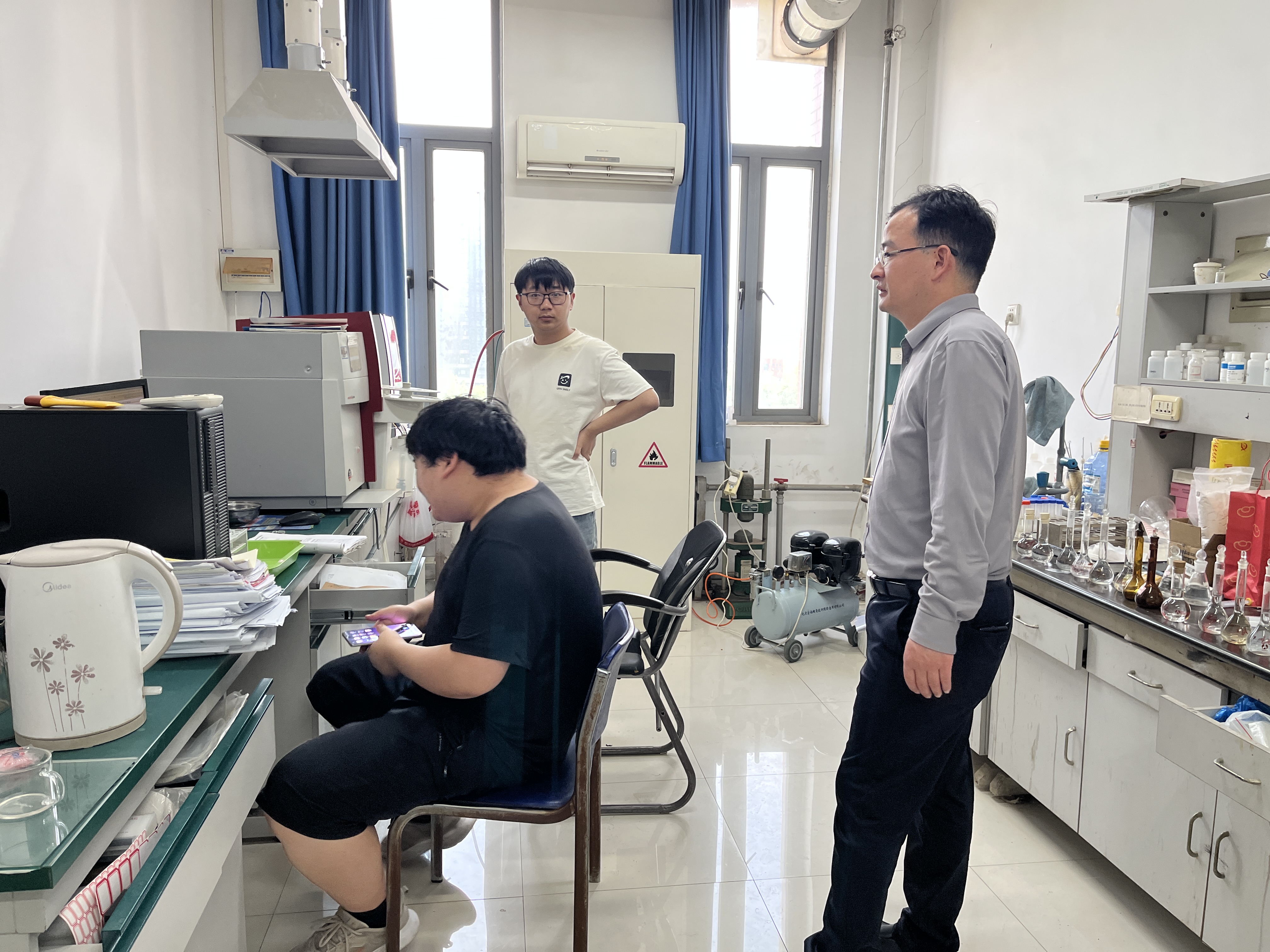 此次检查重点围绕危化品管理、设备操作规范、应急设施配备、高温室、消防安全等关键环节进行实地检查,全面压实安全责任链条。检查过程中,对发现的问题提出明确整改要求,强调相关责任人要立行立改,对不能立即整改的要及时上报制定相关措施。检查过程中强调,各科研室、教学实验室须严格落实实验室安全责任制,加强日常巡查,确保安全隐患及时发现、及时处置;对假期仍需运行的实验项目,须规范操作流程,做好安全防护措施,确保实验室安全管理工作不松懈。