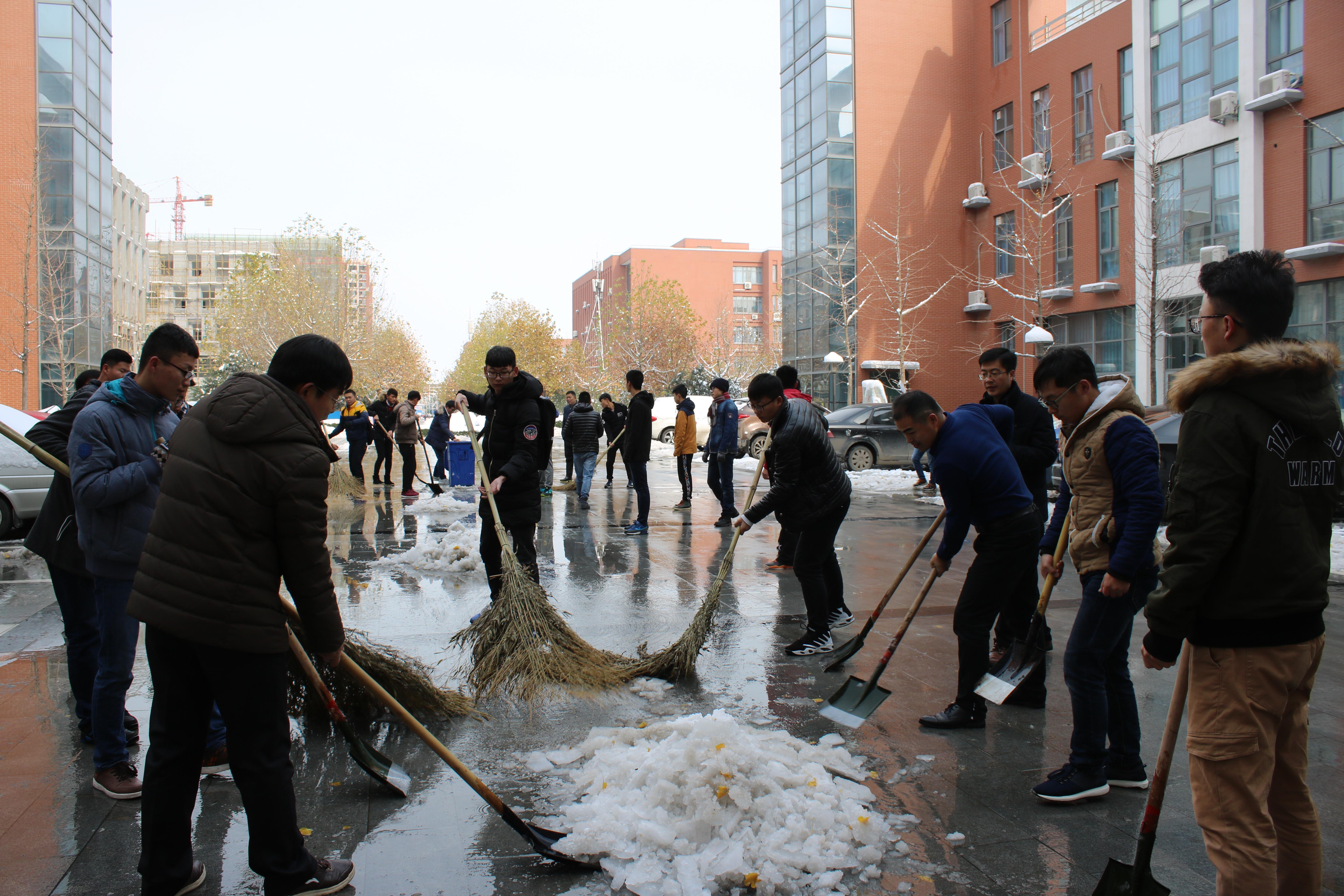 上午十点半,没课的同学及部分老师已经到达化工楼下,大家摩拳擦掌热情高涨,待除雪工具到位后大家分头进行。本次除雪任务分为两部分:一是将学院教学楼周围道路的积雪清理干净,二是将班车乘车点附近主干道上清理出一条通道,方便大家乘车。冬日的太阳虽然耀眼但依旧不能驱走雪后的寒意,虽然大家手上脸上都冻得通红,可是丝毫没有影响热情和工作效率。大家有的用铁锹铲,有的用扫把扫,有的用垃圾车运,不到两个小时就顺利完成了任务,大家在欢声笑语中结束了服务活动。