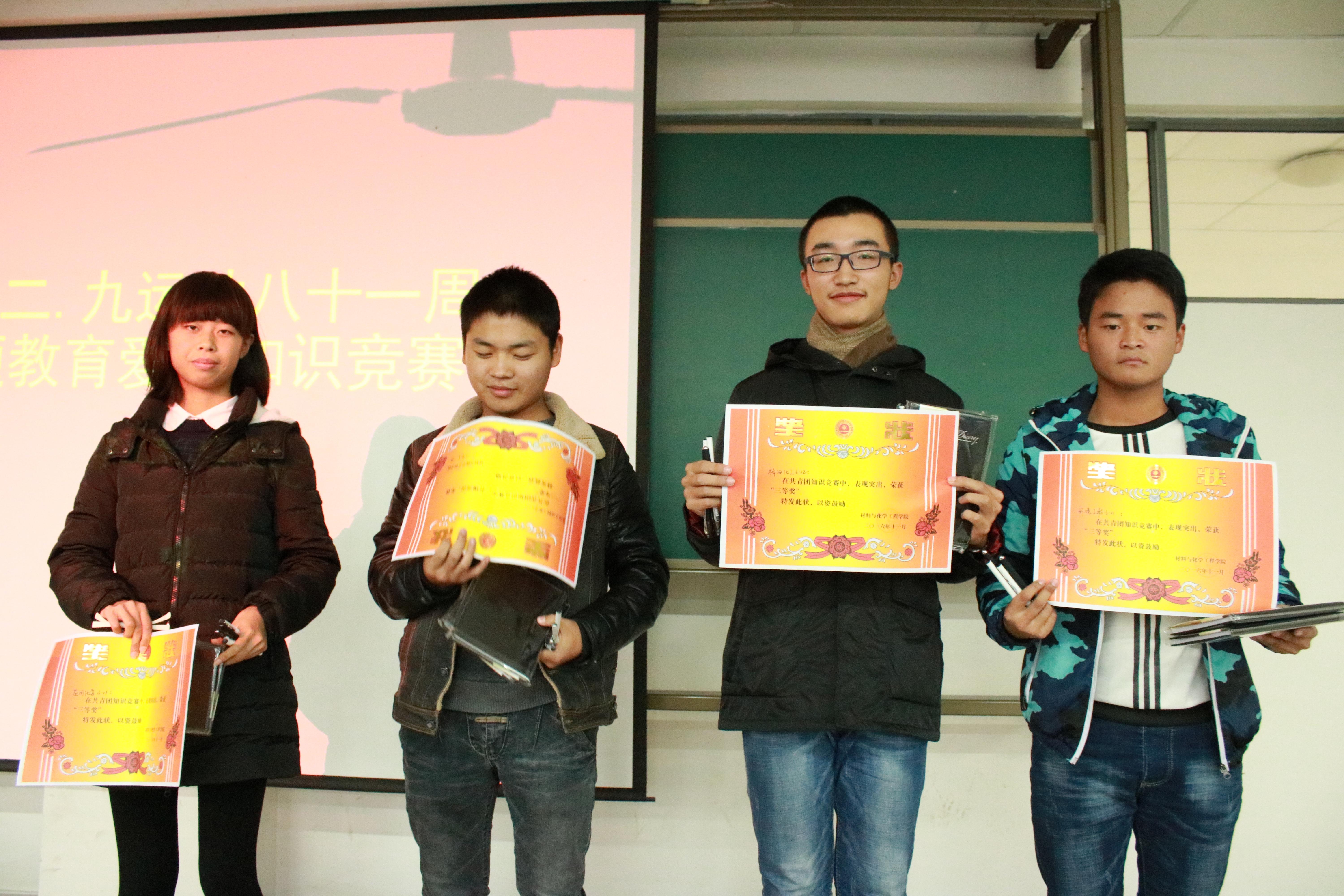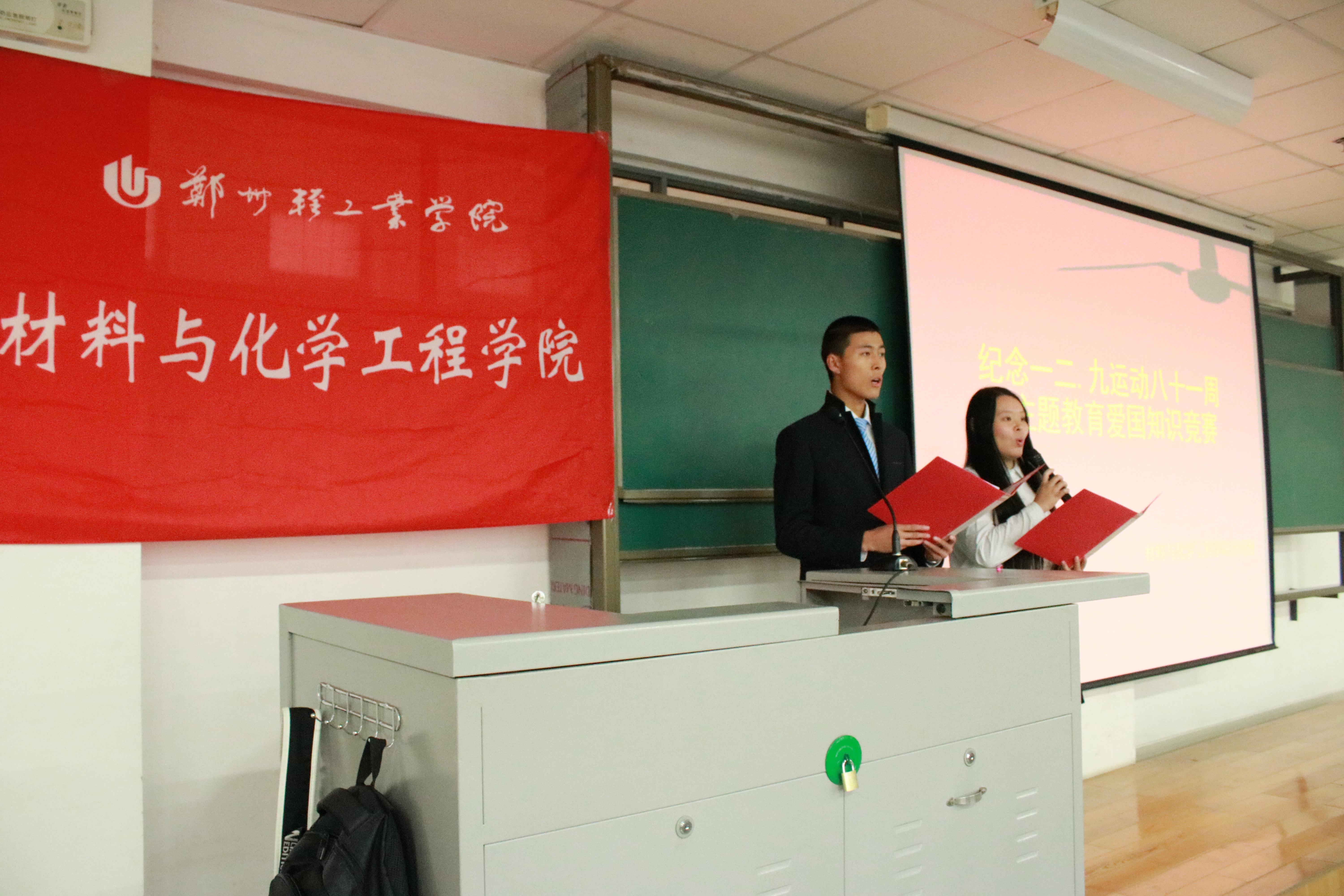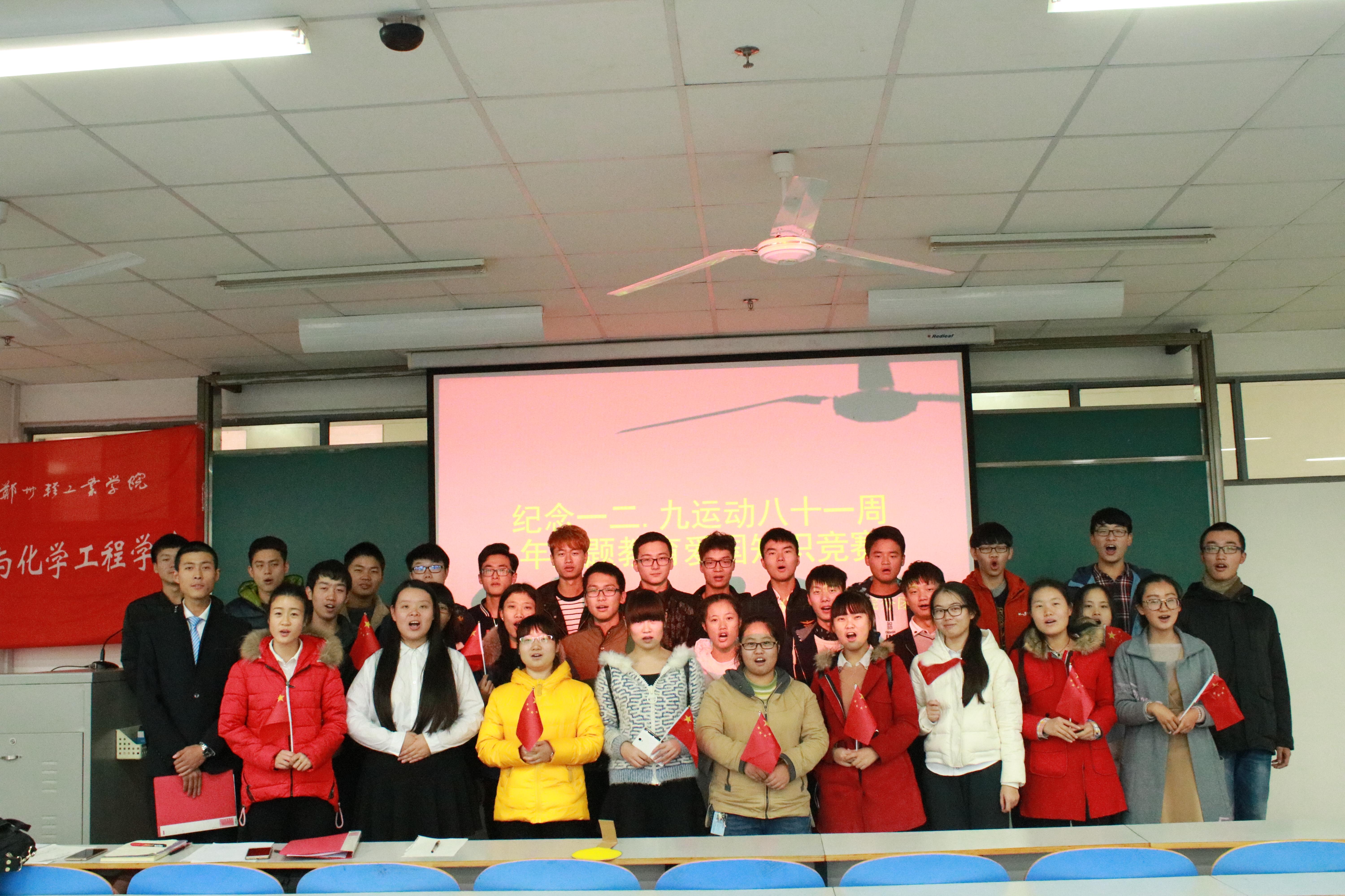 为纪念“一二•九”爱国运动81周年,激励青年团员的爱国热忱,弘扬爱国主义精神,培养青年团员的历史责任感、使命感和高尚的道德情操及增强大学生责任意识,大力弘扬爱国主义精神,材料与化学工程学院于2016年11月23日在二教916举办了“一站到底”纪念一二.九运动八十一周年主题教育爱国知识竞赛。学院分团委学生会代表和15、16级优秀学生代表参与了此次竞赛。