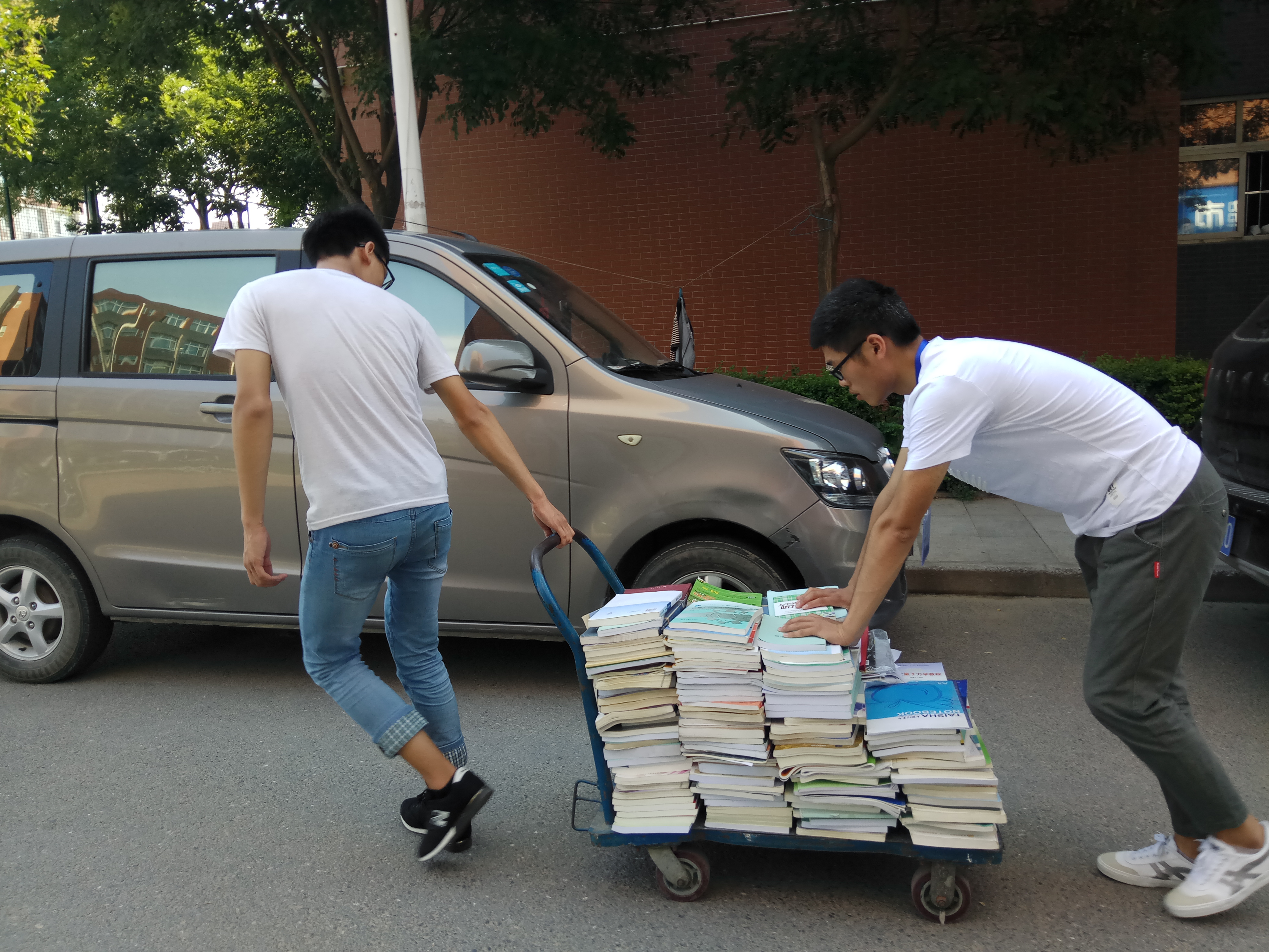 活动开始前,学生会组织部在毕业生间积极倡导,希望学长、学姐们能为母校留下一抹书香。毕业生们纷纷响应,积极整理了自己大学四年积攒下的书籍,为母校奉献了一份宝贵的“财富”,留下了一片真诚的赤子之心。活动中,由运输队和搬运队相互协作,搬运队将大四学长、学姐捐的书本资料搬运到宿舍楼下,运输队则借用推车将书籍转移到化工楼。在大家默契配合、相互协作下,所有书籍都迅速、有效地运到了化工楼。捐赠的书在化工楼统一整理放置,等待送往图书馆,为学院的图书馆建设添砖加瓦。
