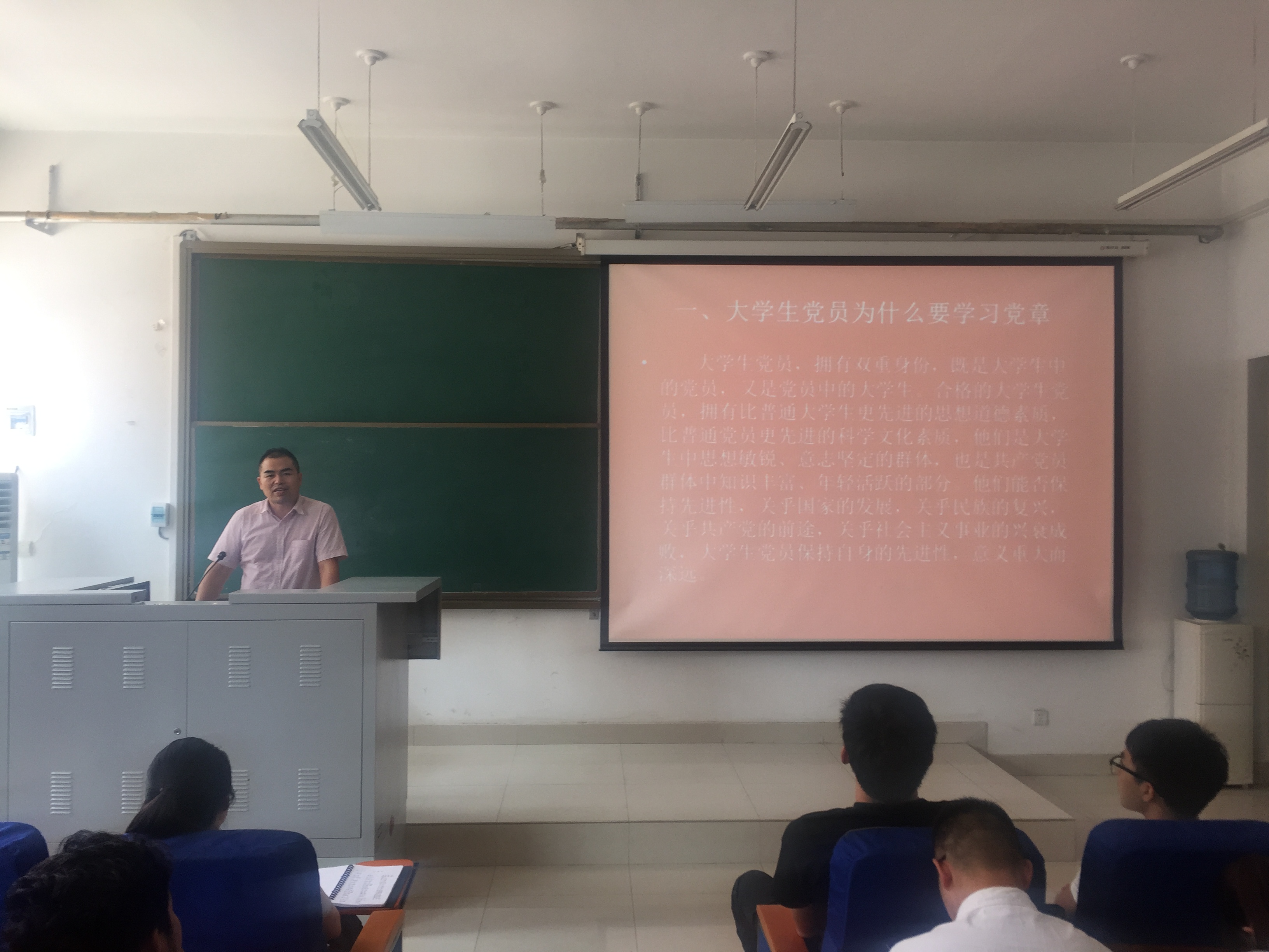 本次党课的主题为:学习党章,做一名合格的大学生共产党员。首先,支部书记朱广正从大学生党员既是大学生中的党员又是党员中的大学生,这一双重身份和党章作为最根本的党规党法的重要意义两个方面讲述了学生党员为什么要学习党章。然后,朱广正同志从党章的地位和作用、学习党章应把握的重点、党章对大学生的要求、共产党员应该是什么样的人等几个方面讲述了大学生党员应如何学习党章。最后,朱广正同志向同学们讲述了如何做一名合格的大学生共产党员,号召同志们要坚定理想信念不动摇;带头贯彻执行党在现阶段的基本路线和方针、政策;勇于开拓,积极进取;要诚心诚意为人民谋利益;坚持群众路线,带领群众努力奋斗。